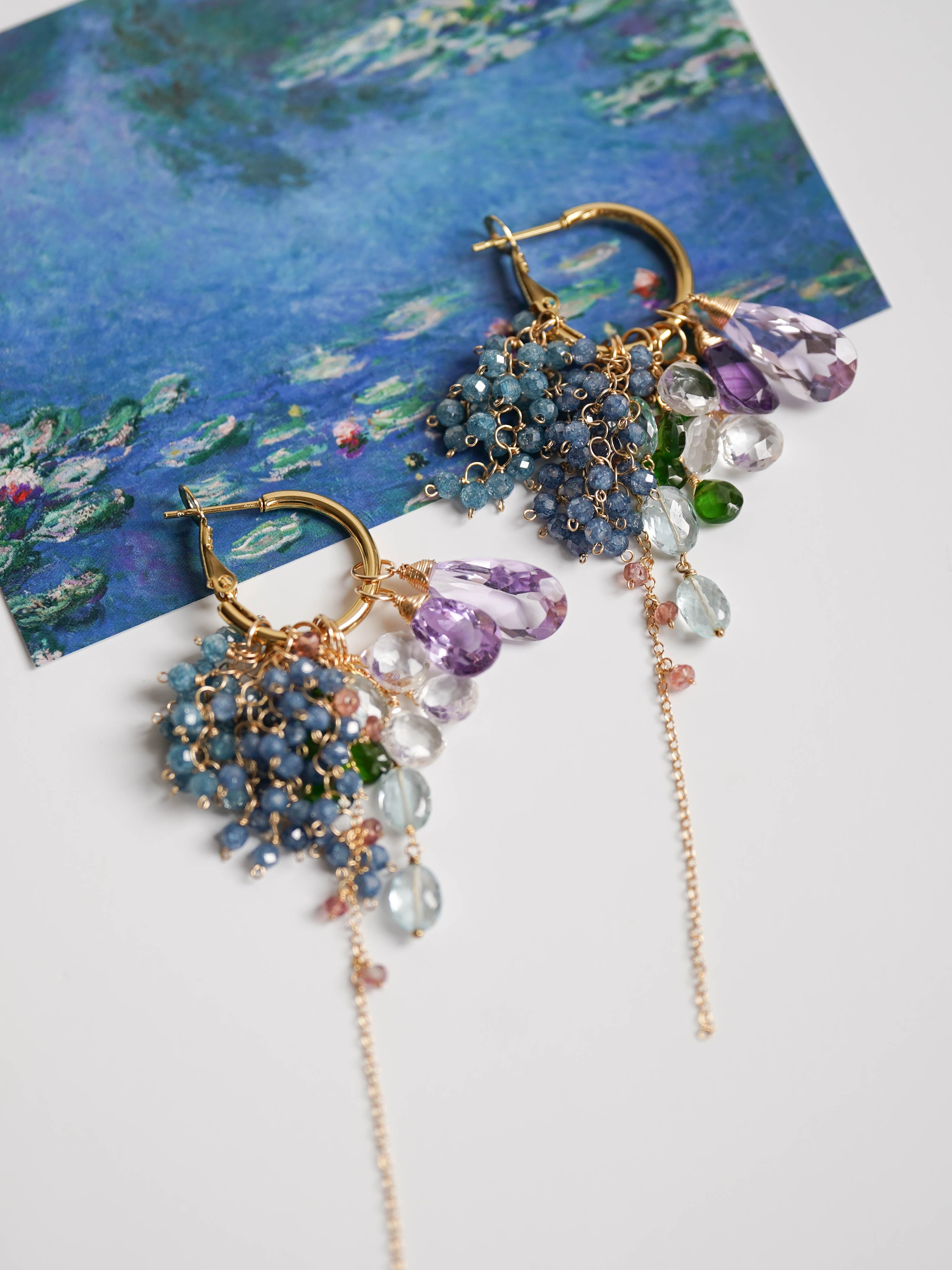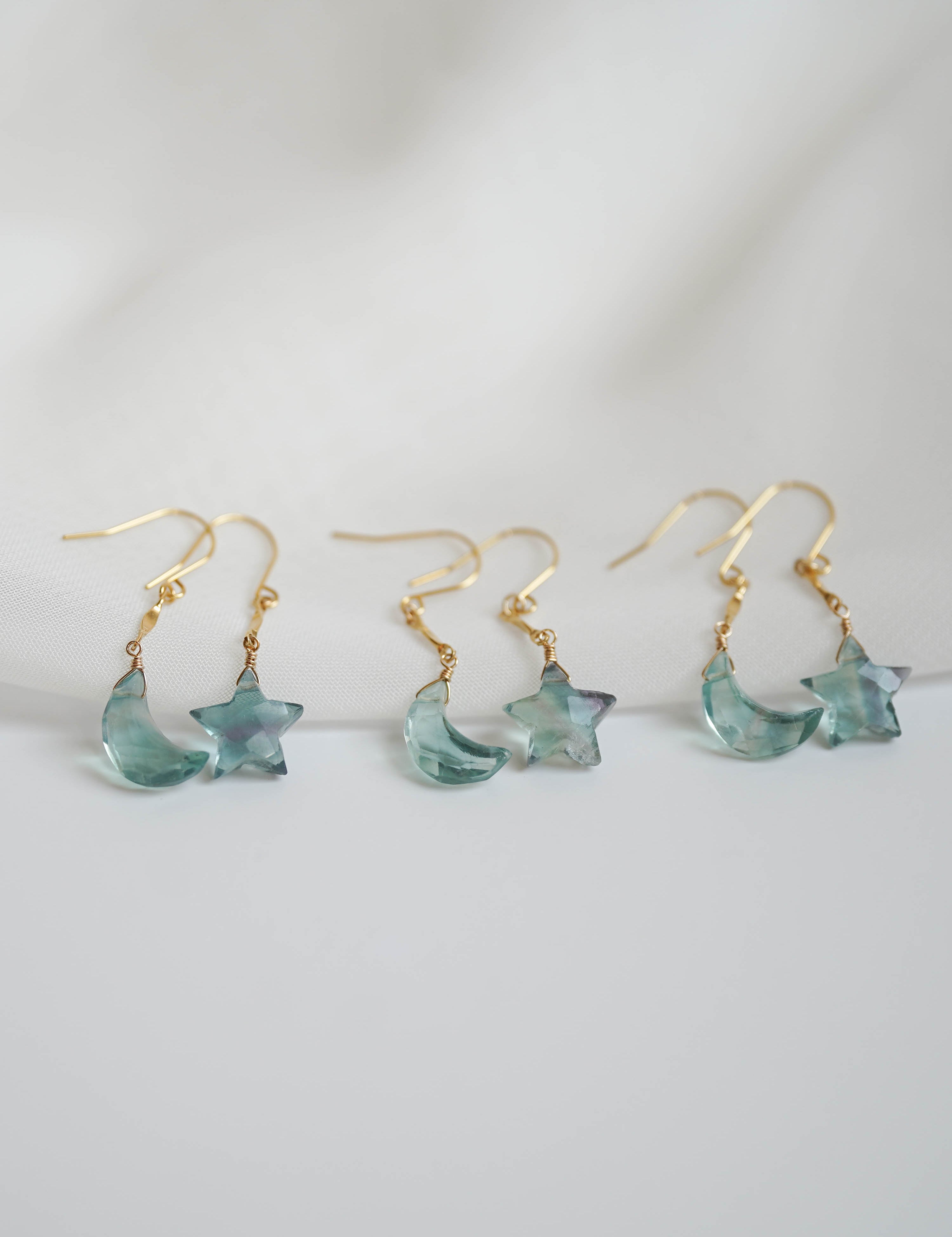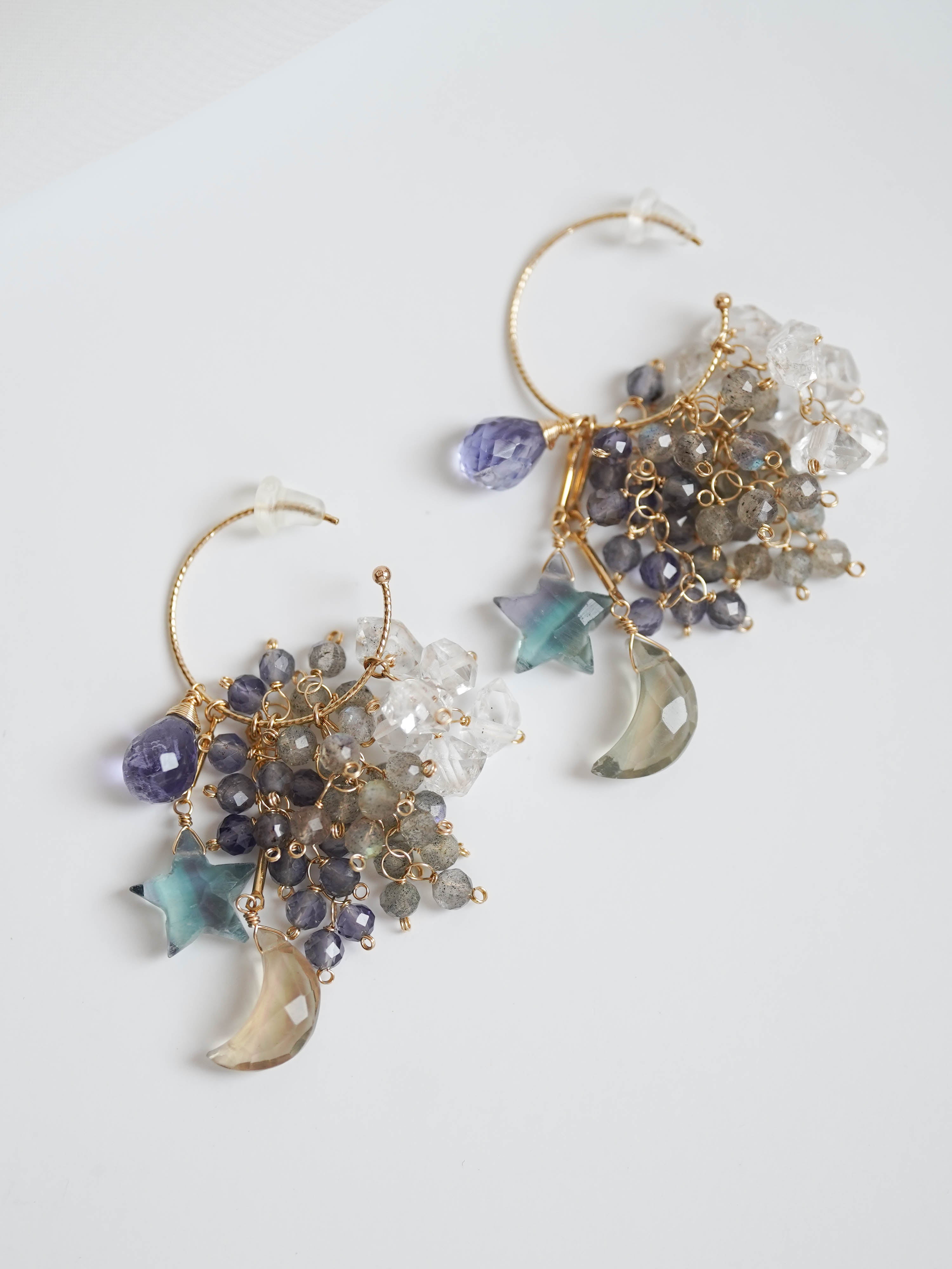 夜空に浮かぶ月と瞬く星をイメージしてデザインしたボリュームのある着せ替えフープピアス。 藍色とグレーの天然石をメインに、星と月モチーフのフローライトがポイントです。 輝きが強いハーキマーダイヤモンドがキラキラと煌めき夜空の星々を連想させてくれます。