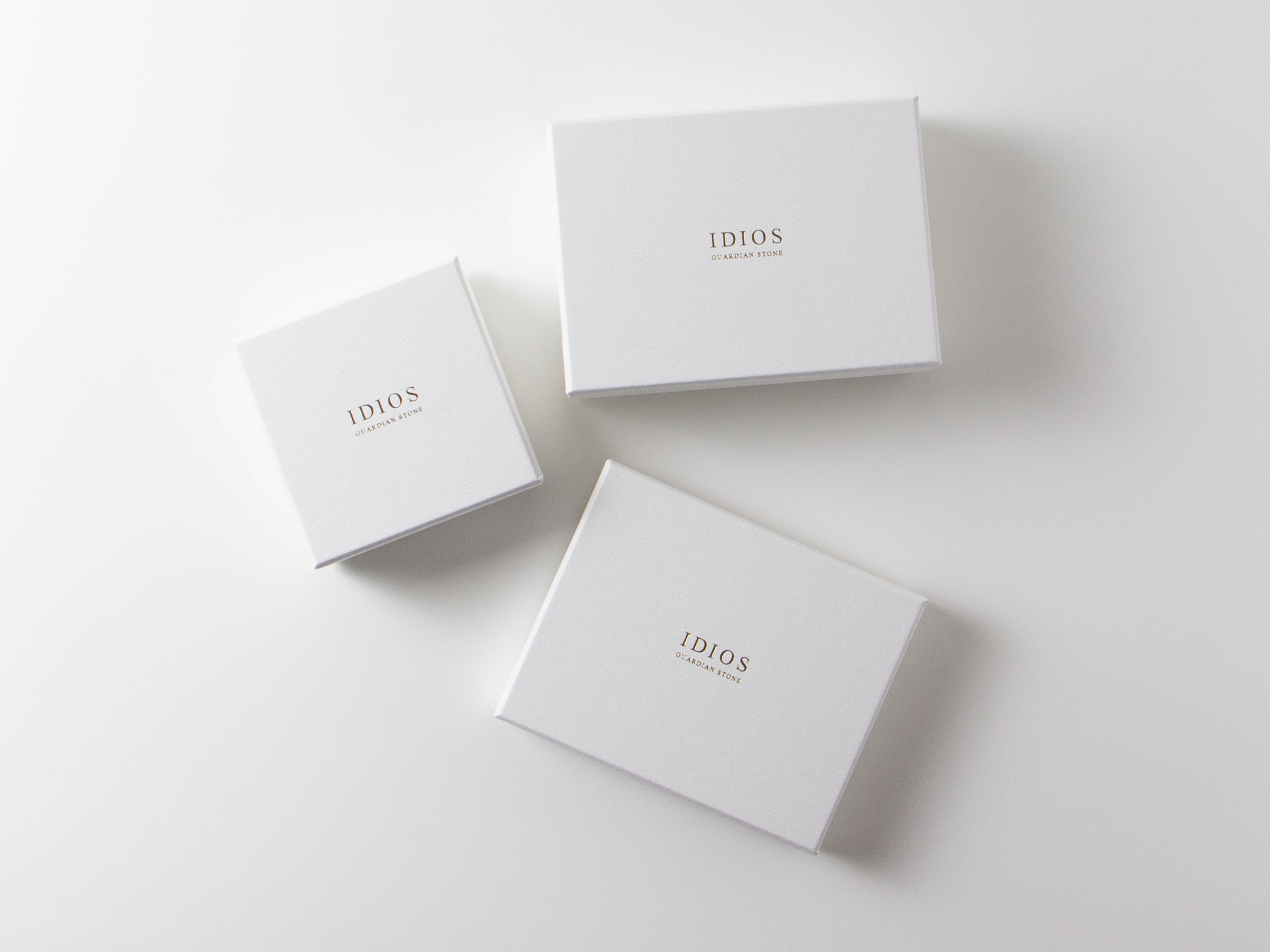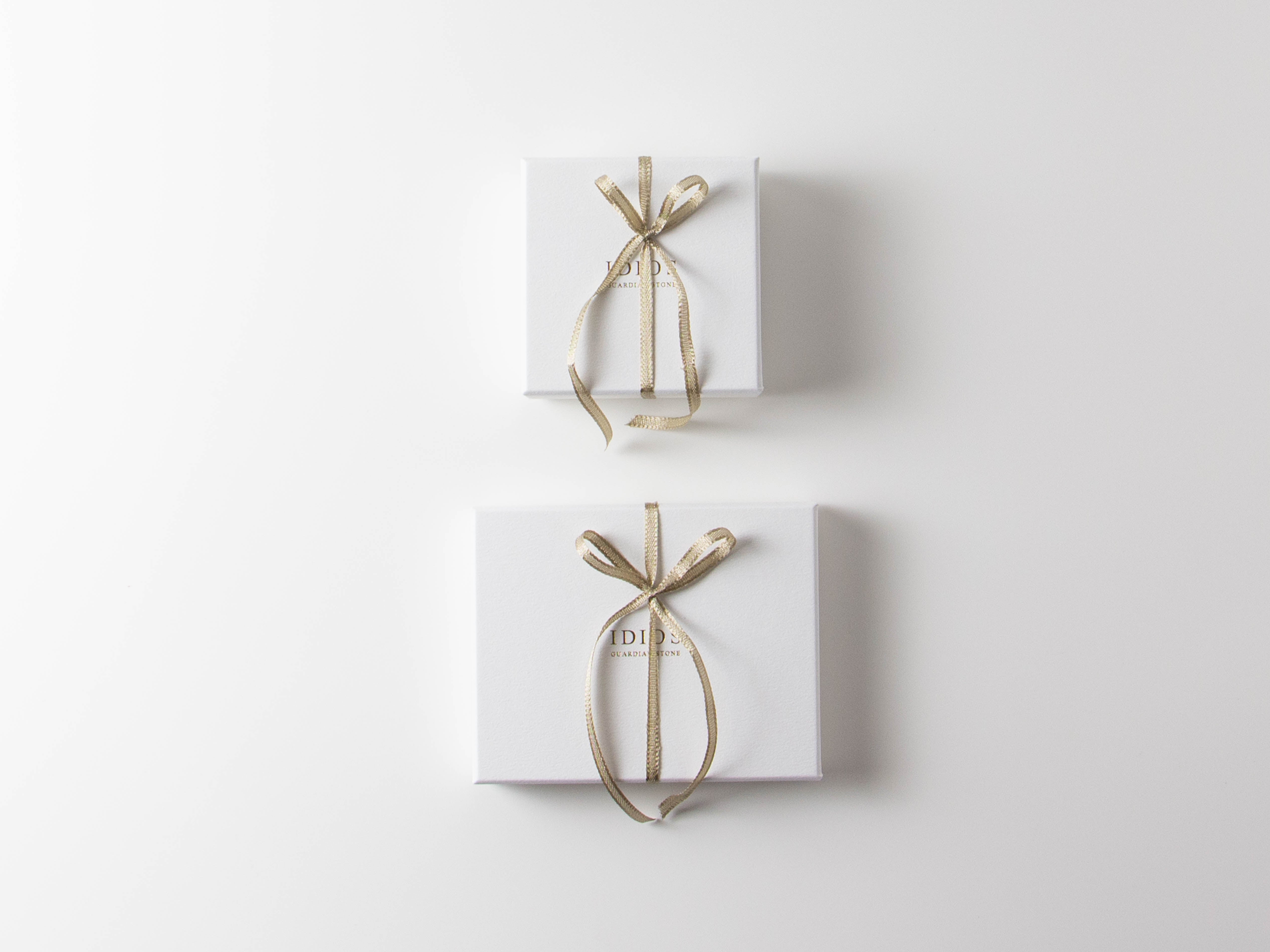 お買い上げの商品はジュエリーボックスに丁寧にお入れしてお届けします。 白い箱にロゴを箔押しした当ショップオリジナルジュエリーボックスです。しっかりとした箱なので中身を守ってくれます。 ジュエリーボックスのサイズは、配送方法により当方でお選びいたします。