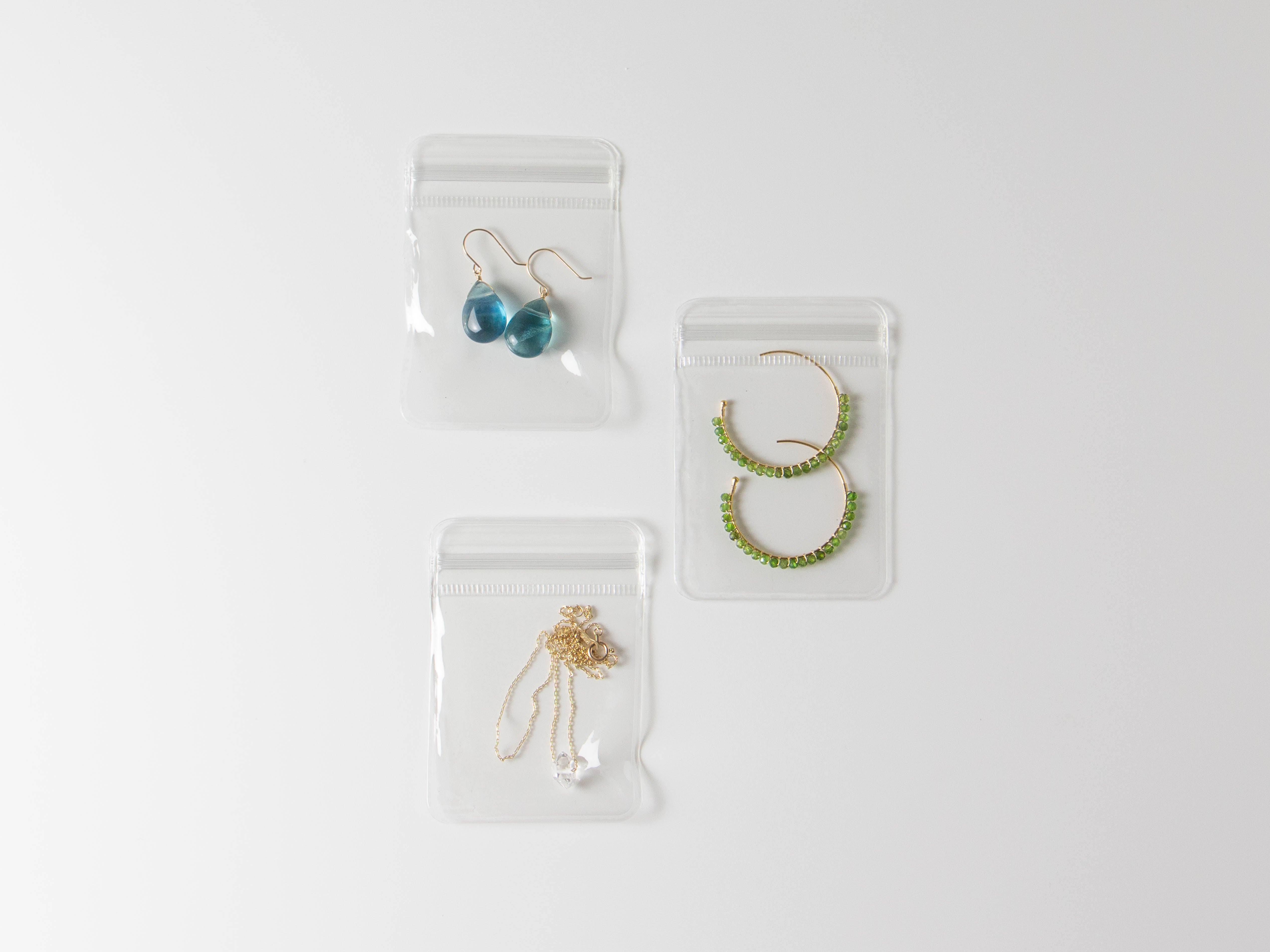 ジュエリーをご注文の方には保管用のクリアミニバックをプレゼント。ジッパー付きで密閉ができるので、貴金属の酸化を防ぎ、長く綺麗な状態を保ってくれます。 透明なので中身が見え、アクセサリーボックスやカバンの中からすぐに取りだせるのが便利です。 ジュエリーの保管はもちろん、お出かけや旅行にジュエリーを持って行く際にもぜひご利用ください。 クリアミニバックはご注文点数と同じ枚数をおつけします。