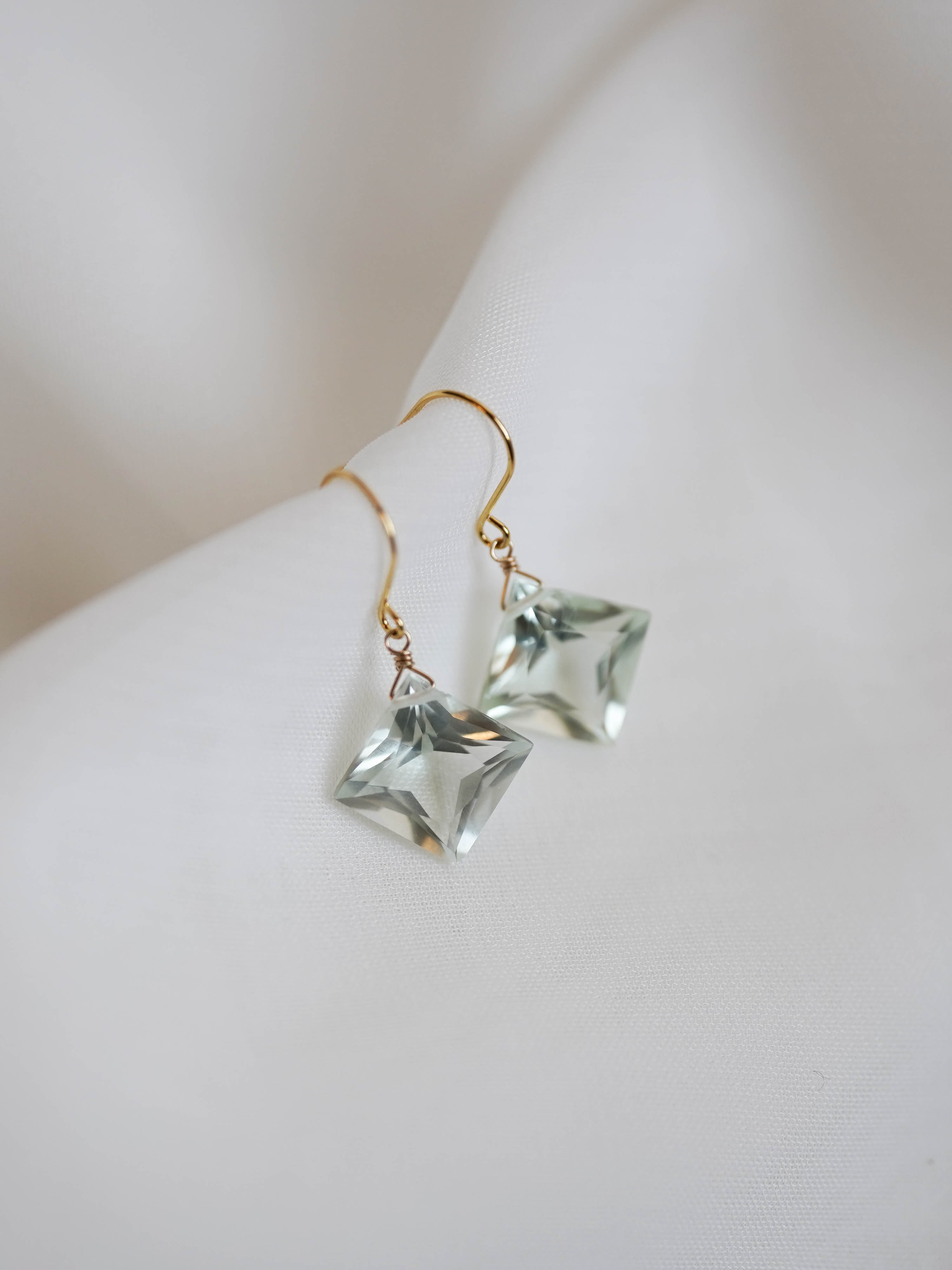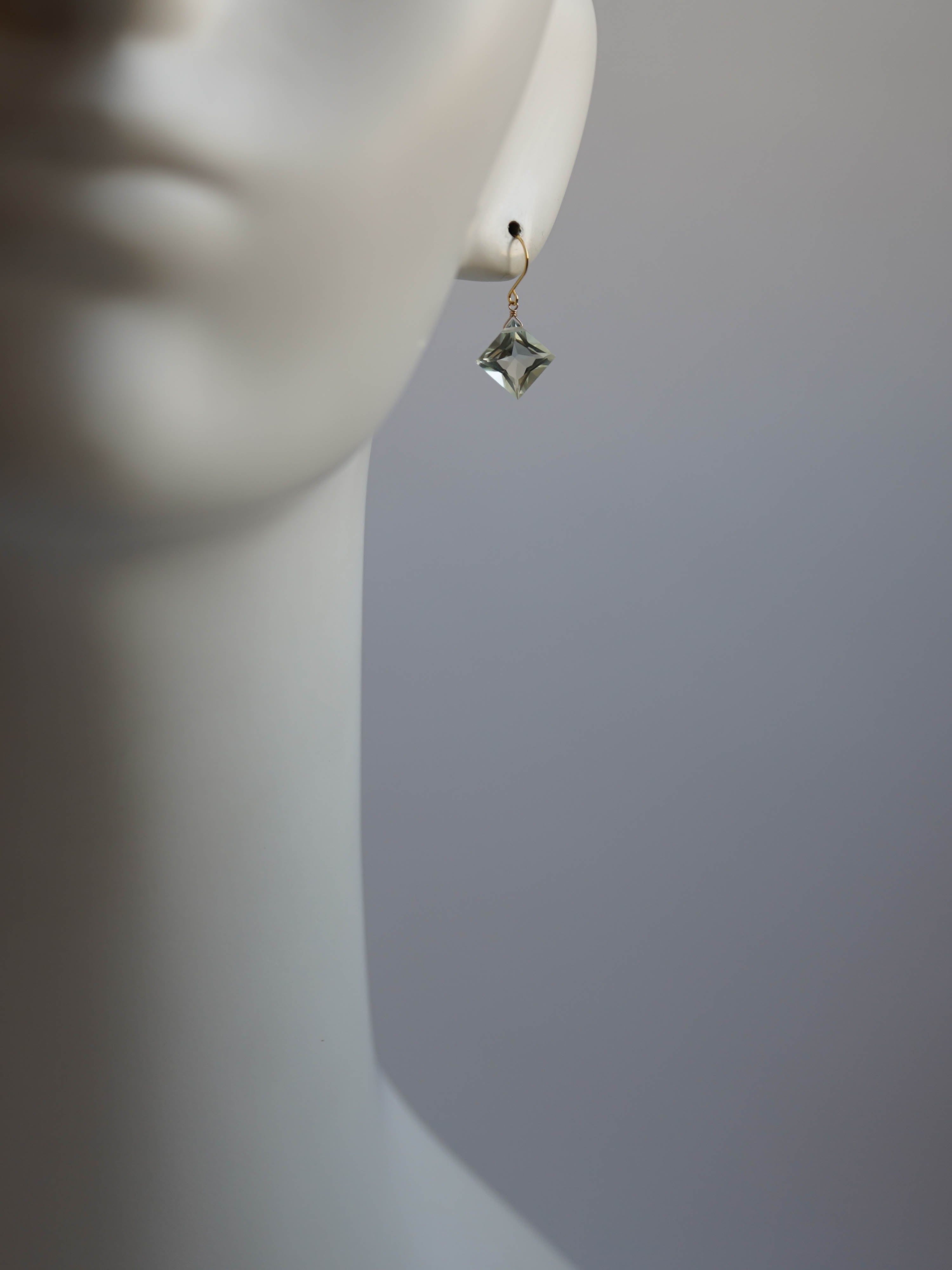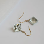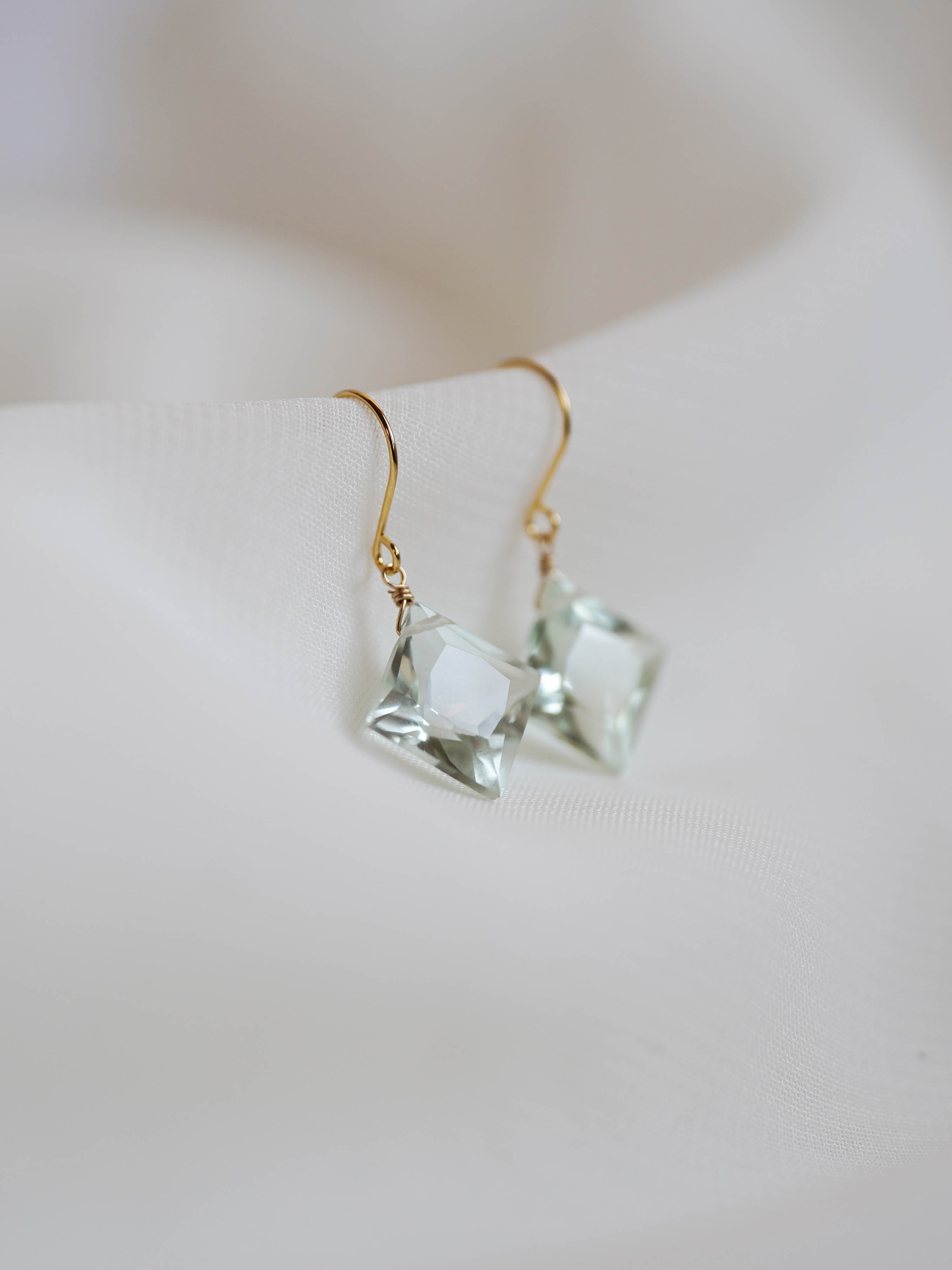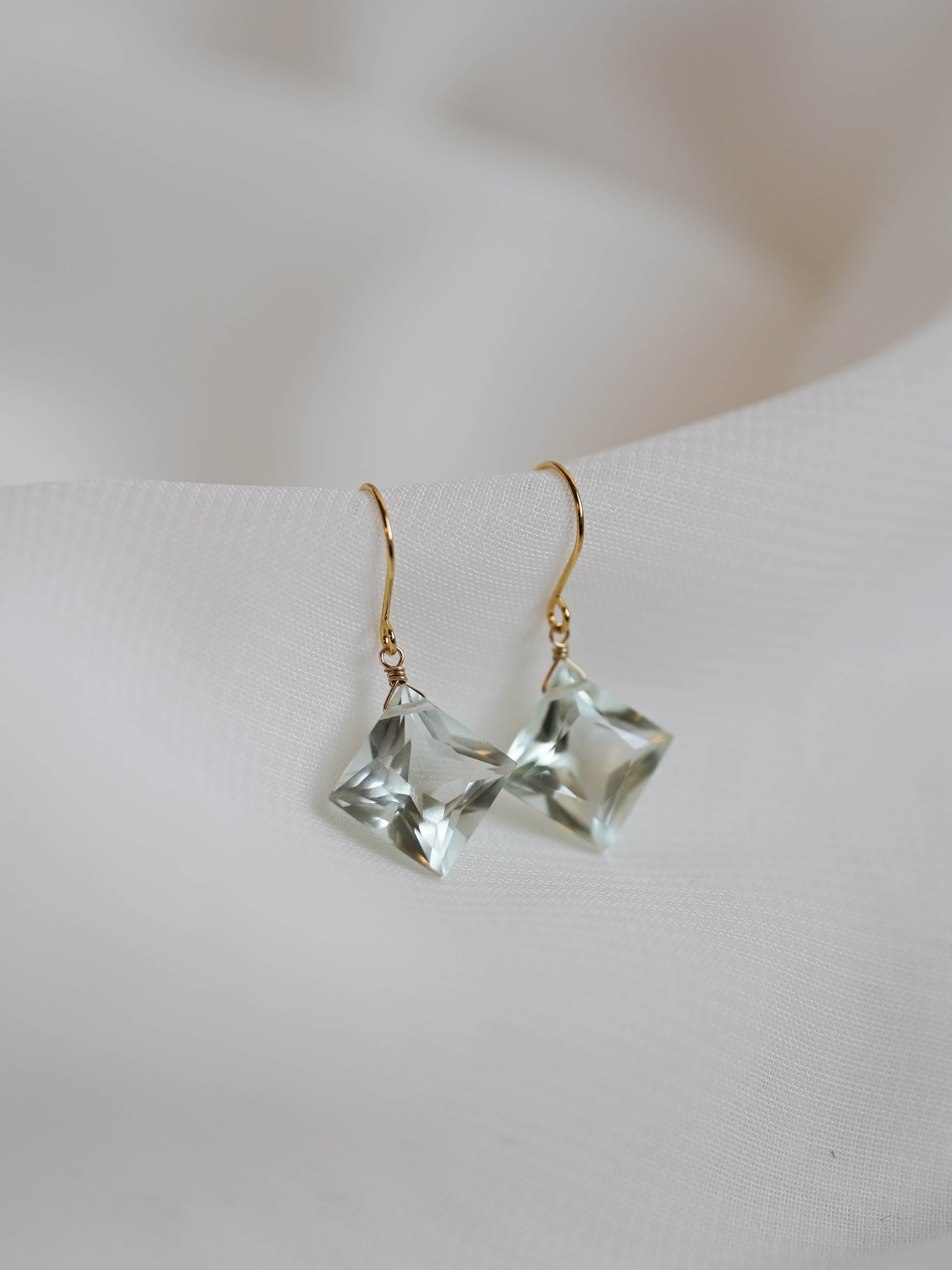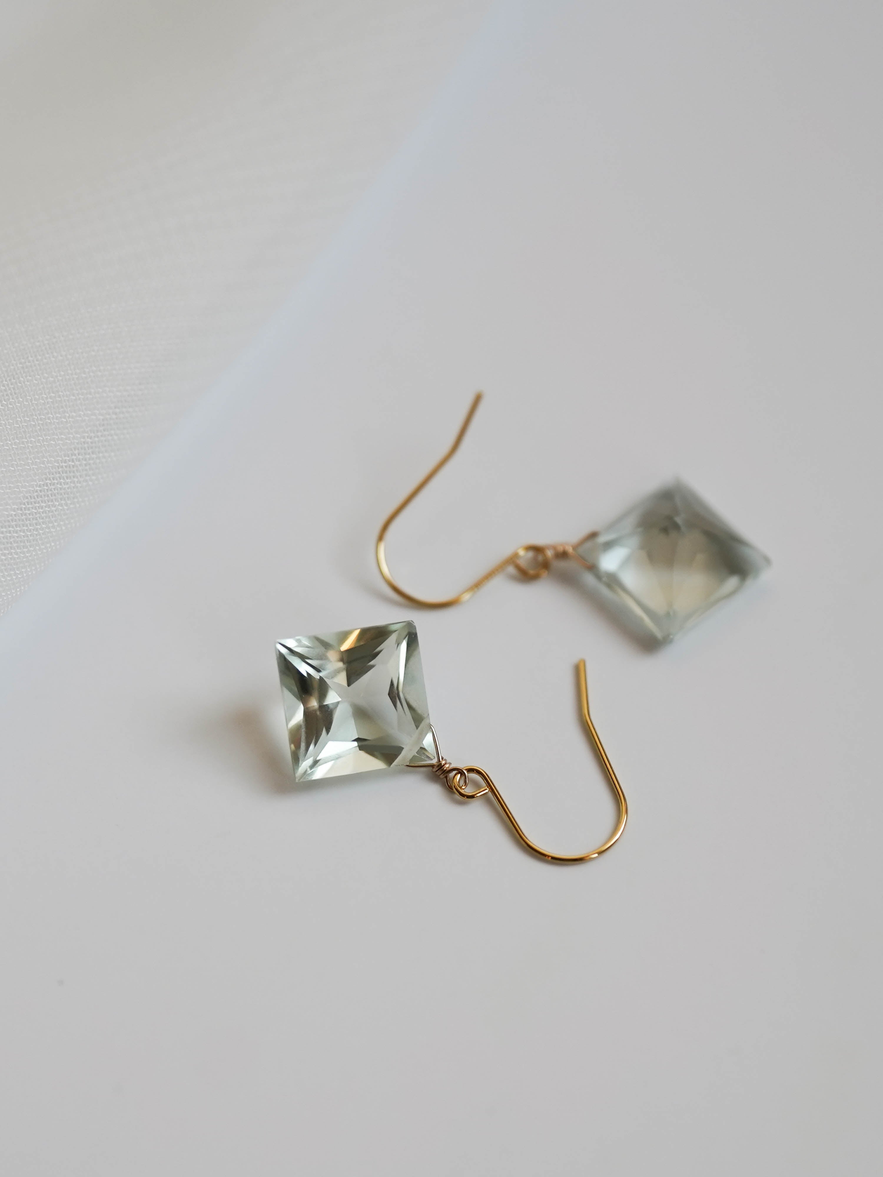 ひときわ輝きの美しいプリンセスカットのグリーンアメジスト。前面は平ら、裏側はピラミッドのように尖ったカットで、上品さと高級感のある輝きです。宝石質の美しいグリーンアメジストでどのペアもサイズ、輝きともに変わりありません。自然光はもちろん、夜の照明のもとでも美しく輝くので夜会や夜のお出かけにもおすすめです。
