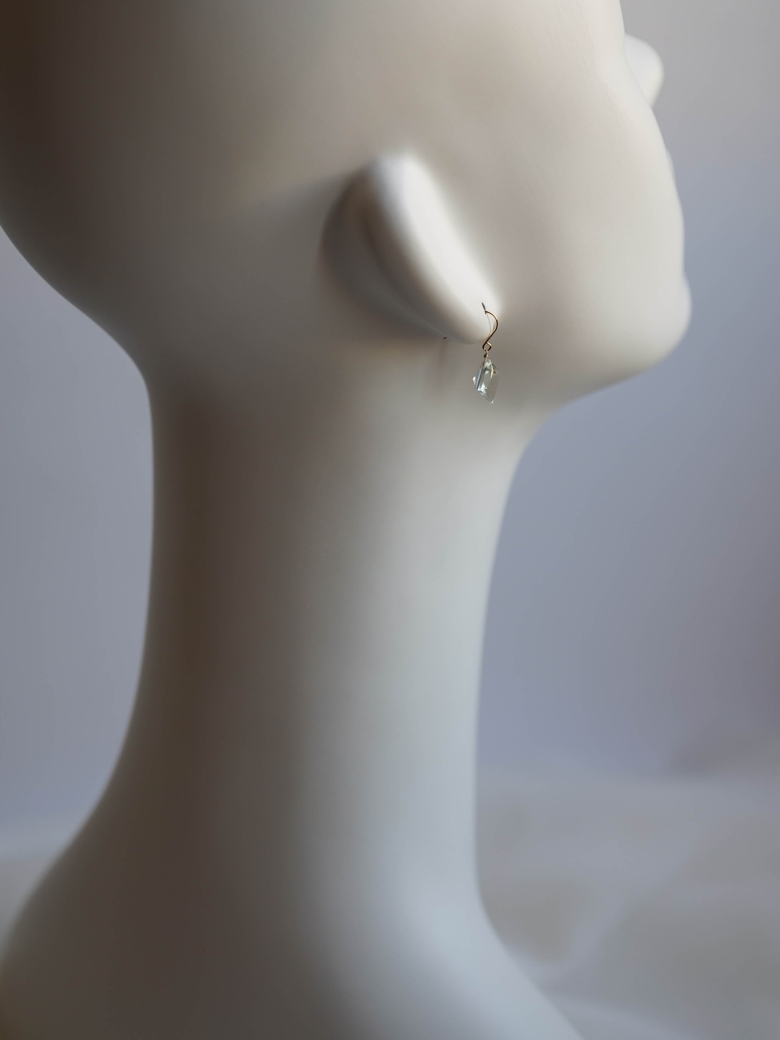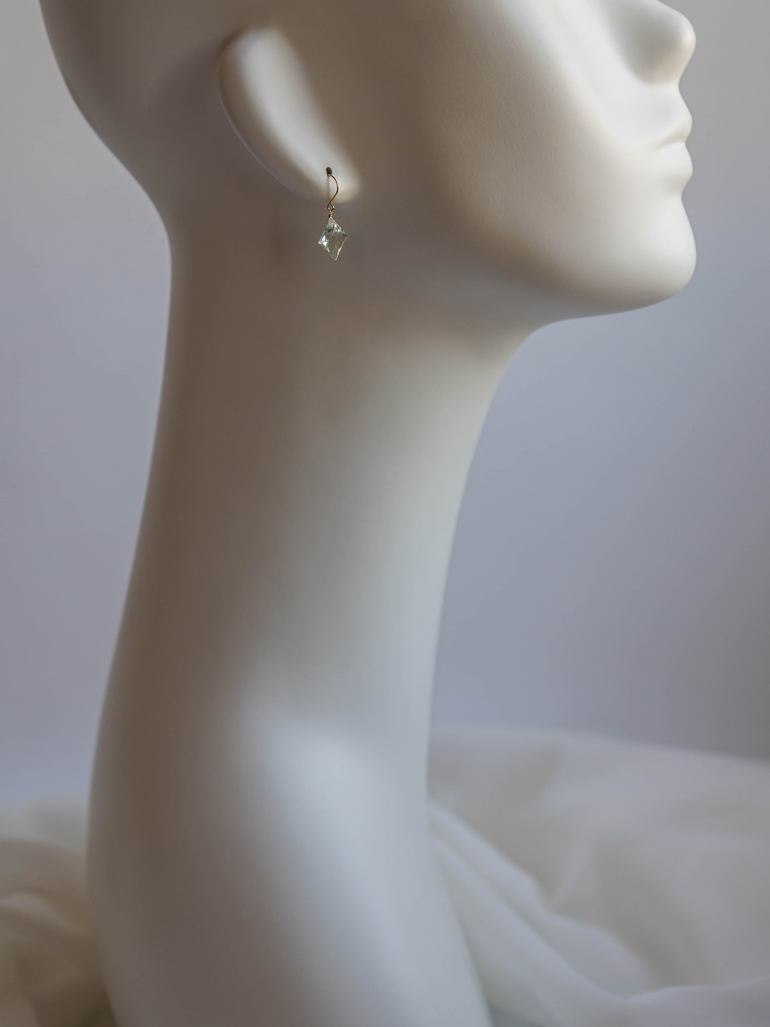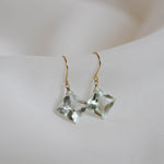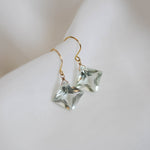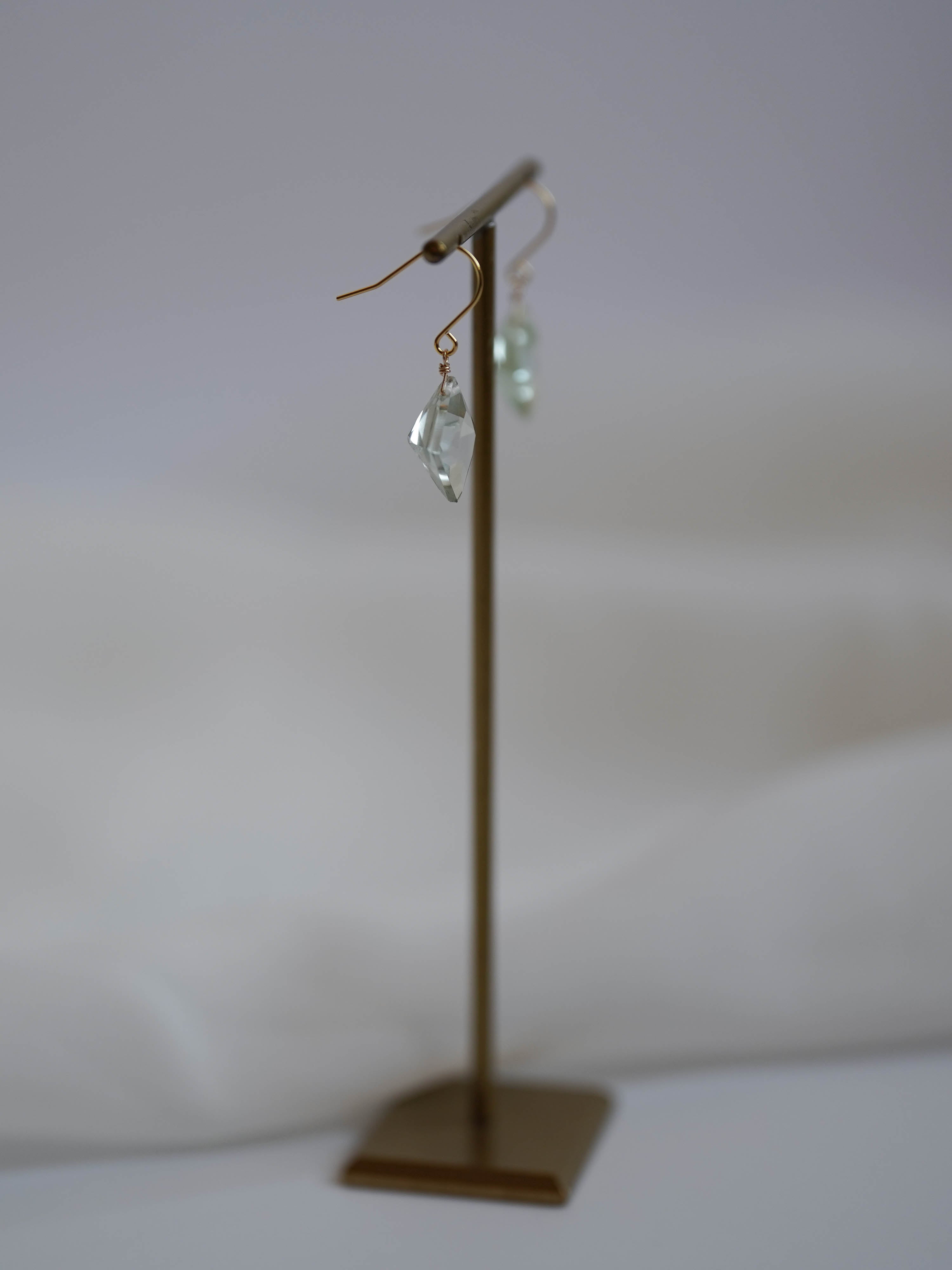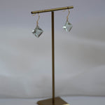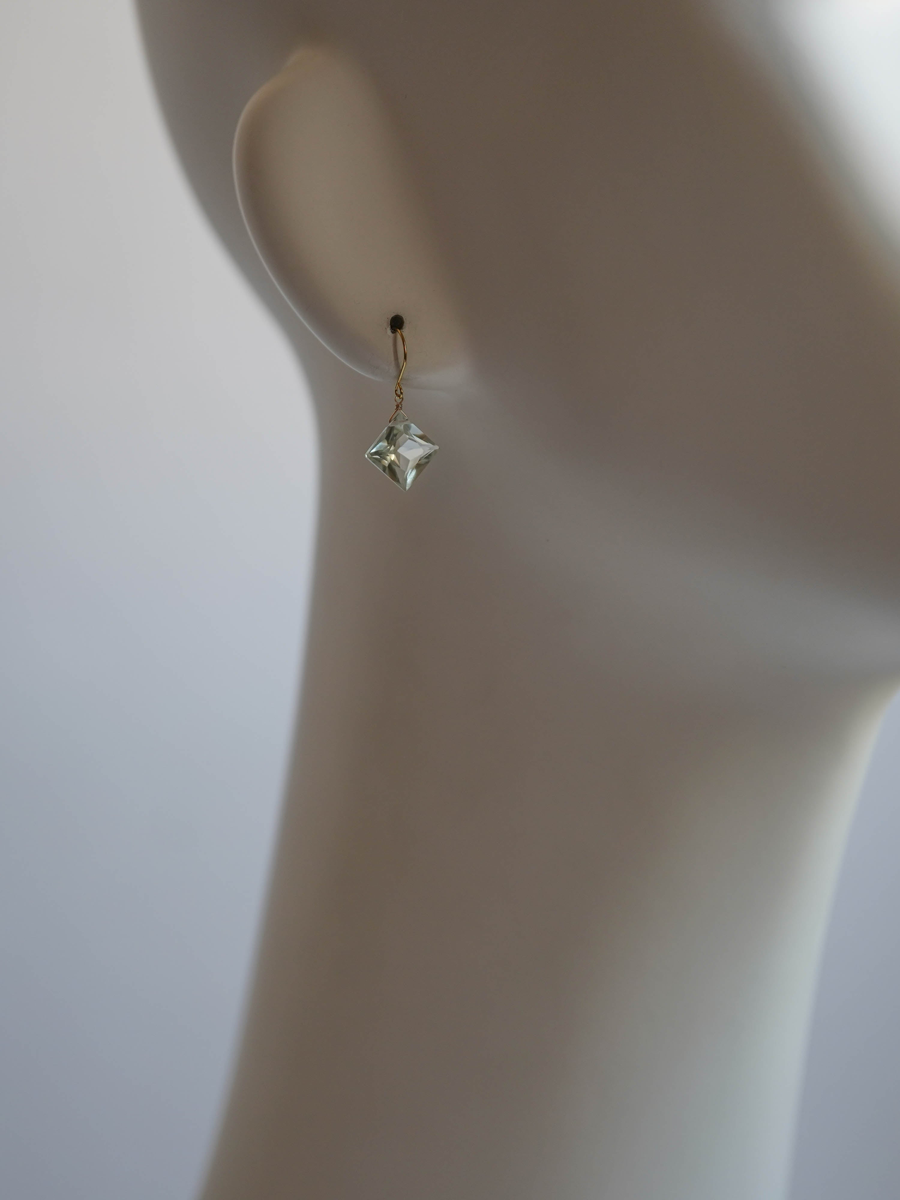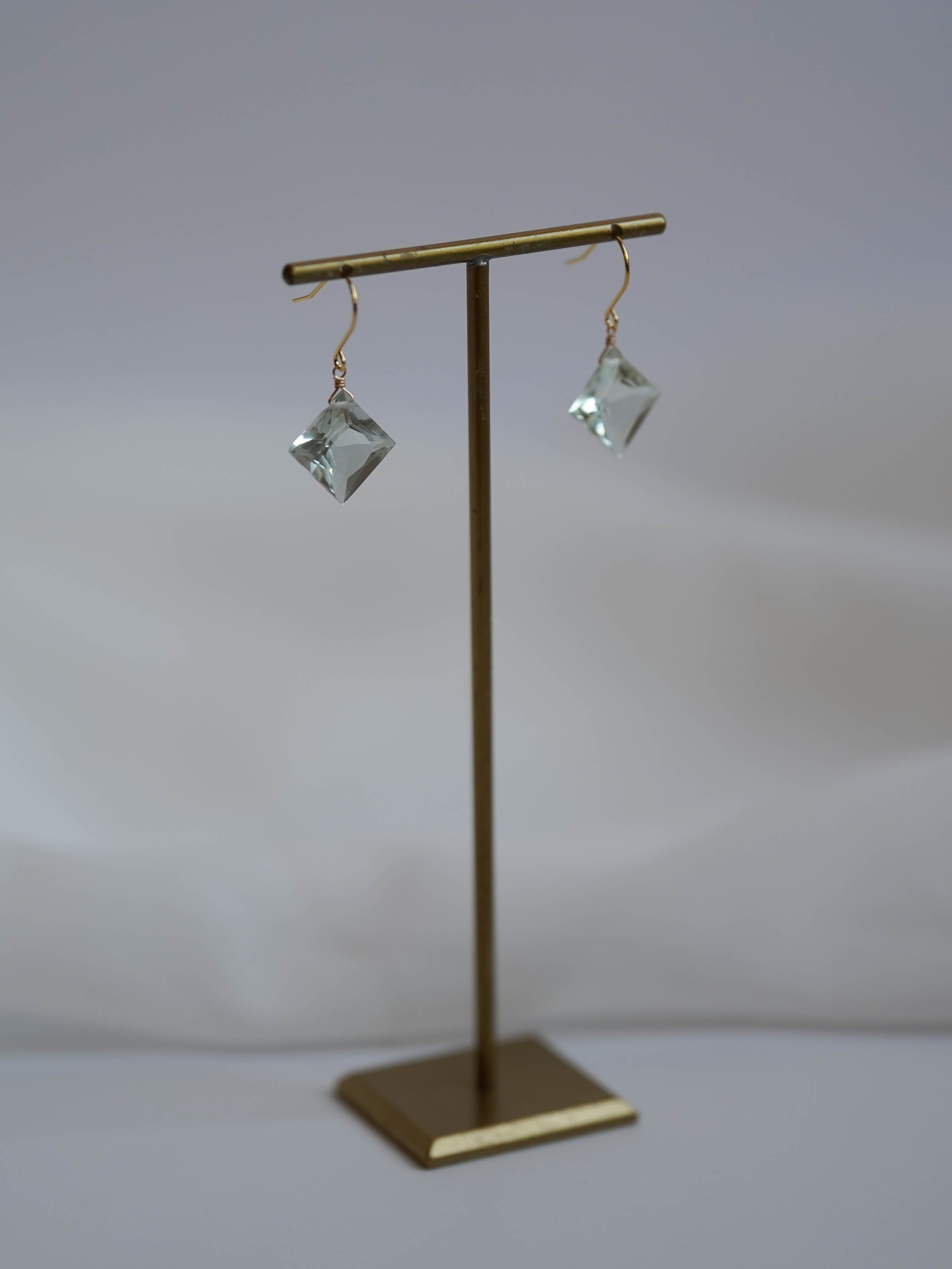 ひときわ輝きの美しいプリンセスカットのグリーンアメジスト。前面は平ら、裏側はピラミッドのように尖ったカットで、上品さと高級感のある輝きです。宝石質の美しいグリーンアメジストでどのペアもサイズ、輝きともに変わりありません。自然光はもちろん、夜の照明のもとでも美しく輝くので夜会や夜のお出かけにもおすすめです。