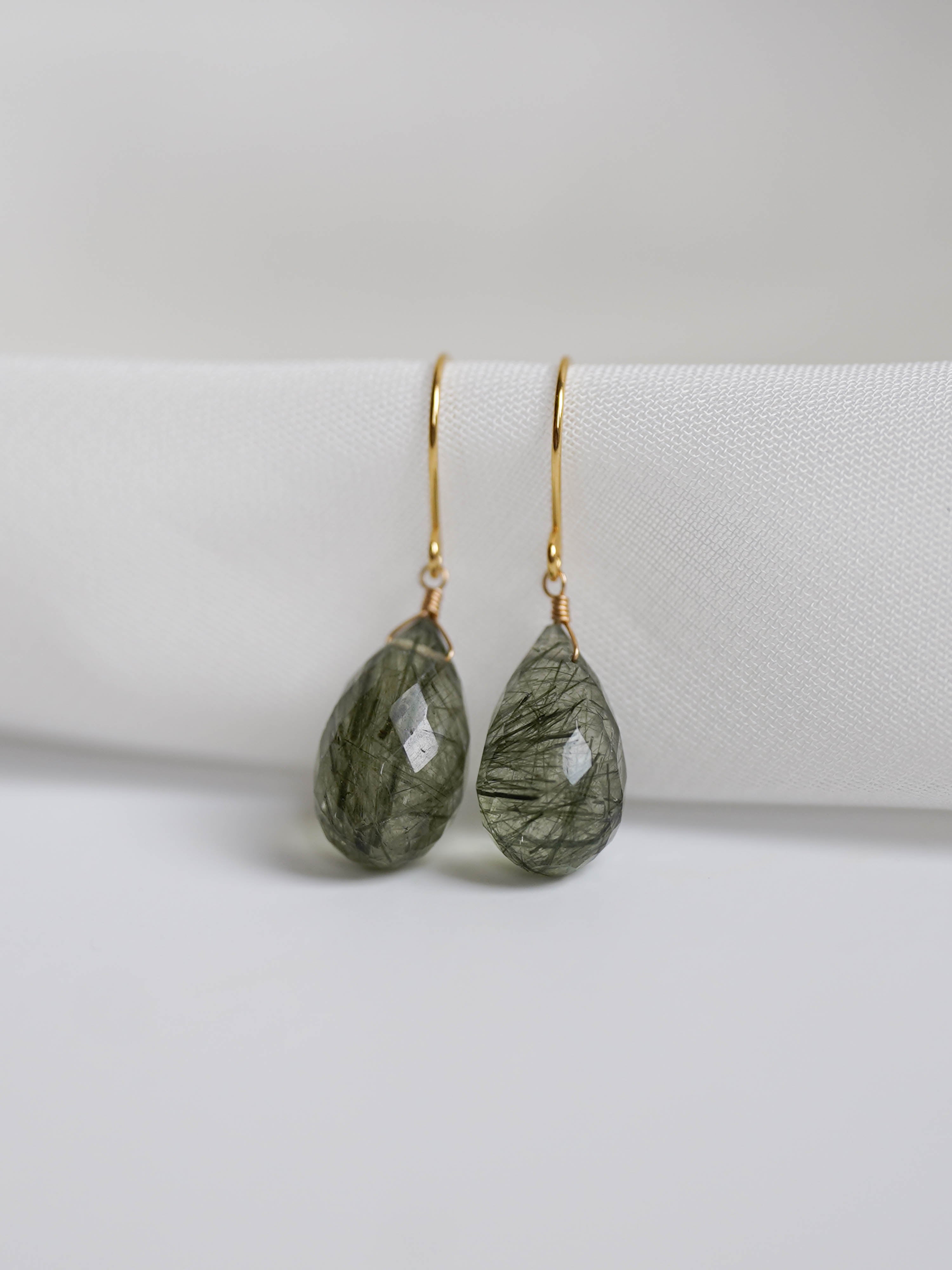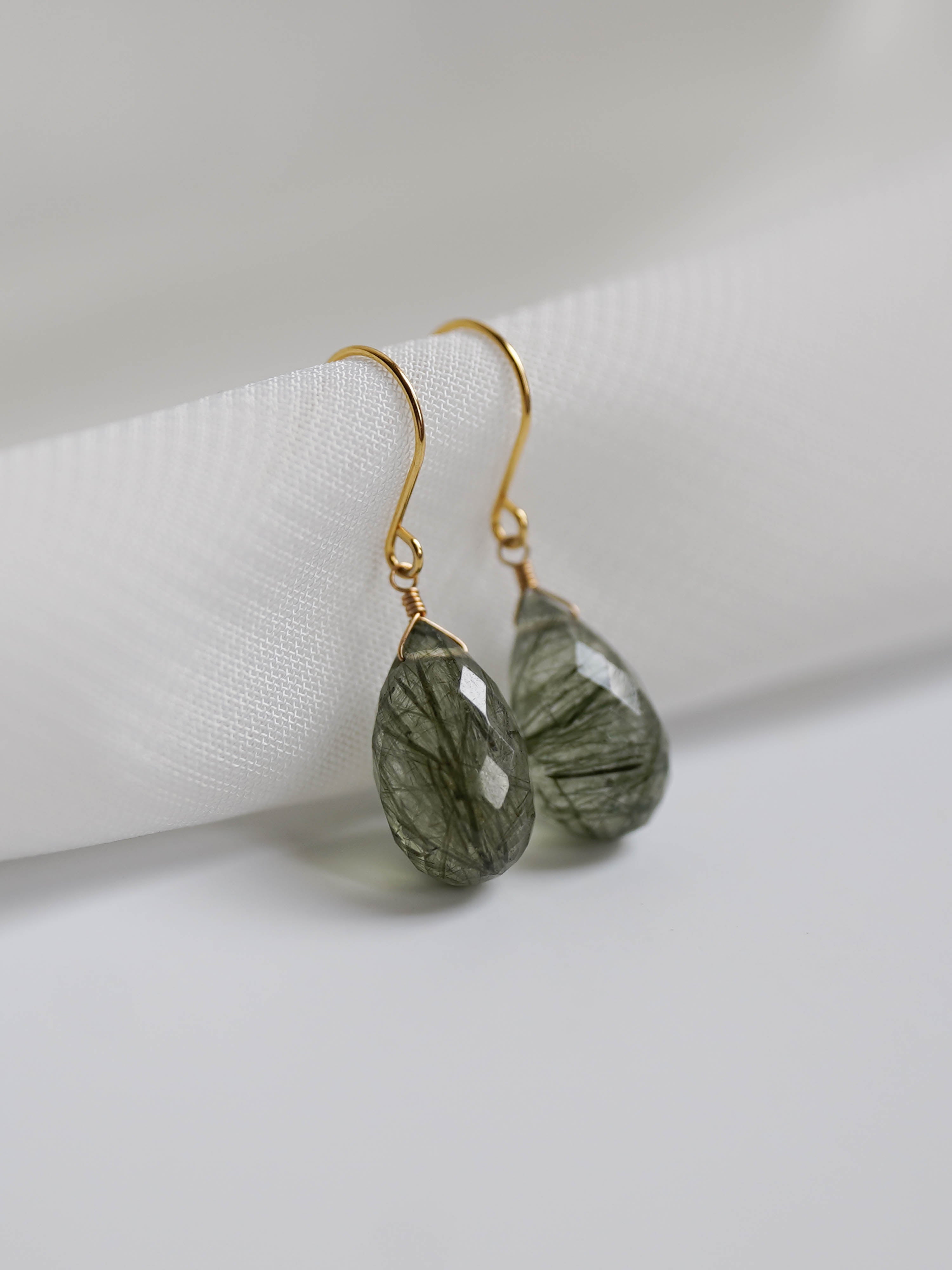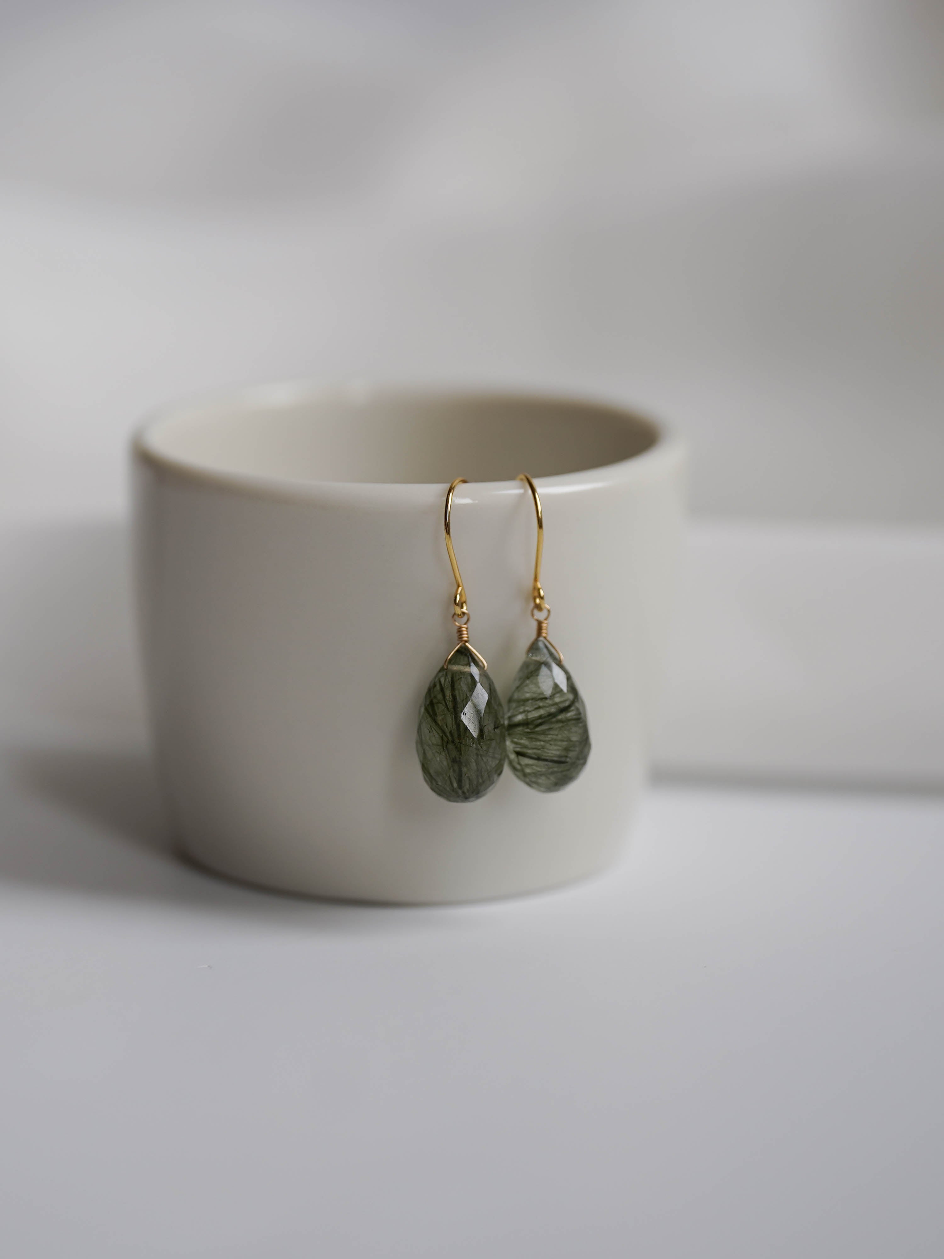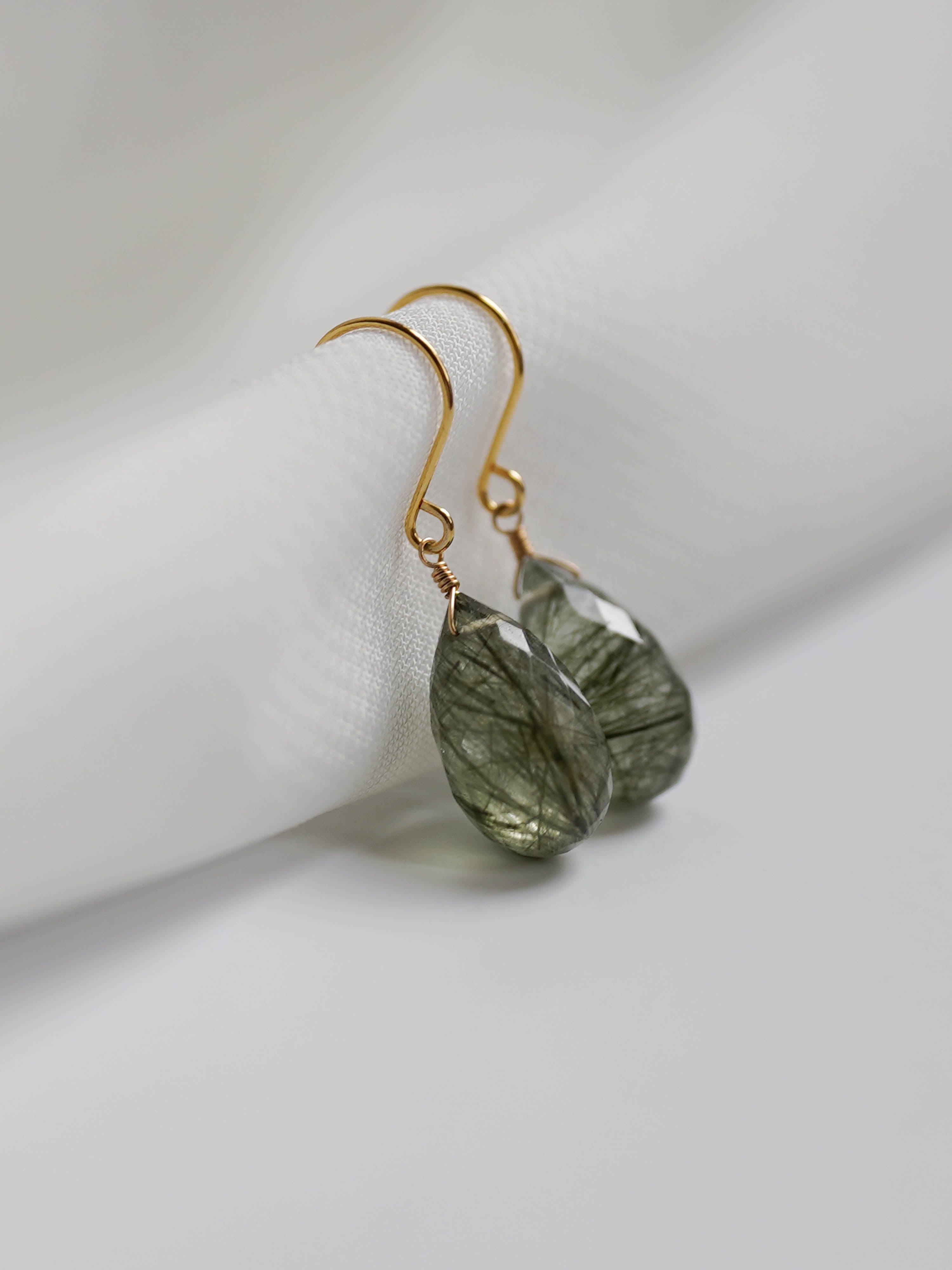 透明な水晶の中に緑色の細い針状鉱物が入った天然石グリーンルチルクォーツ。モスグリーンの針のような内包物はアクチノライトです。ランダムに入った針がアートのような模様を織り成し、落ち着いた大人っぽい印象に。大自然のアートを閉じ込めたような一石で見ているだけでもヒーリング効果があります。