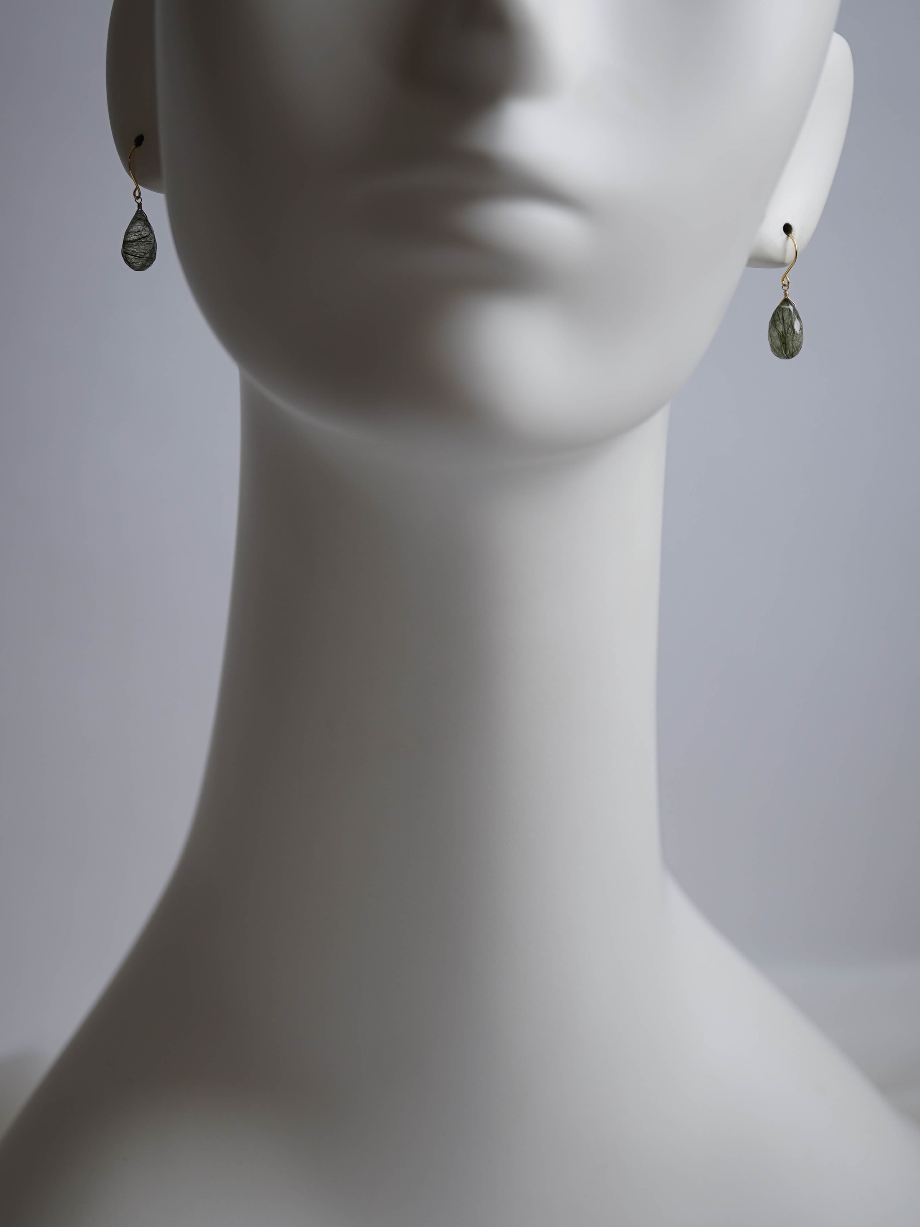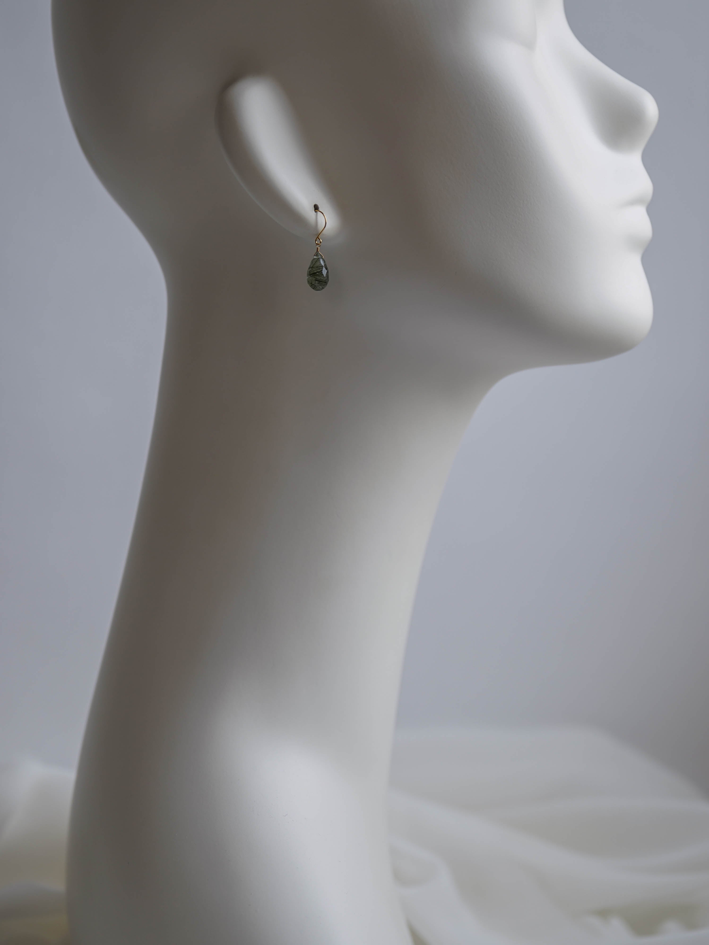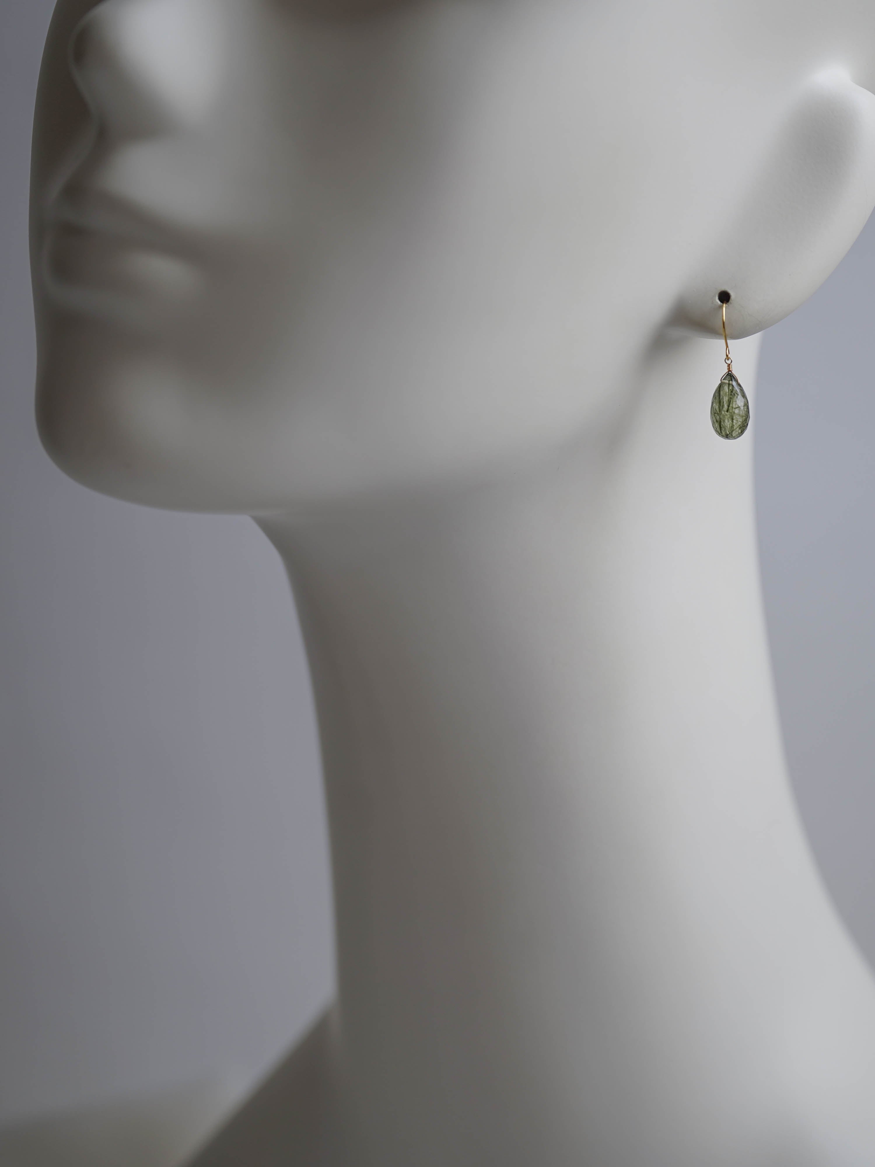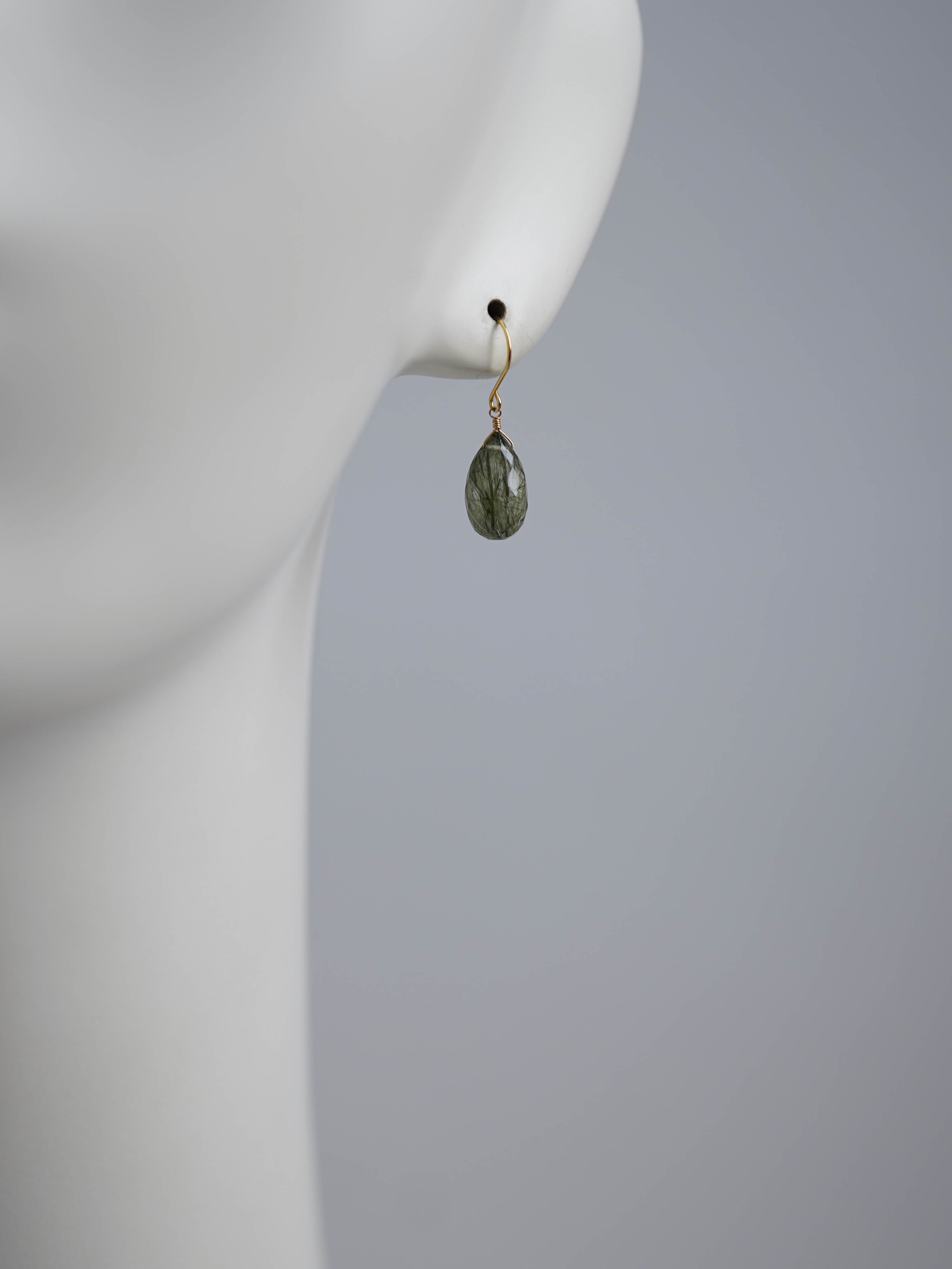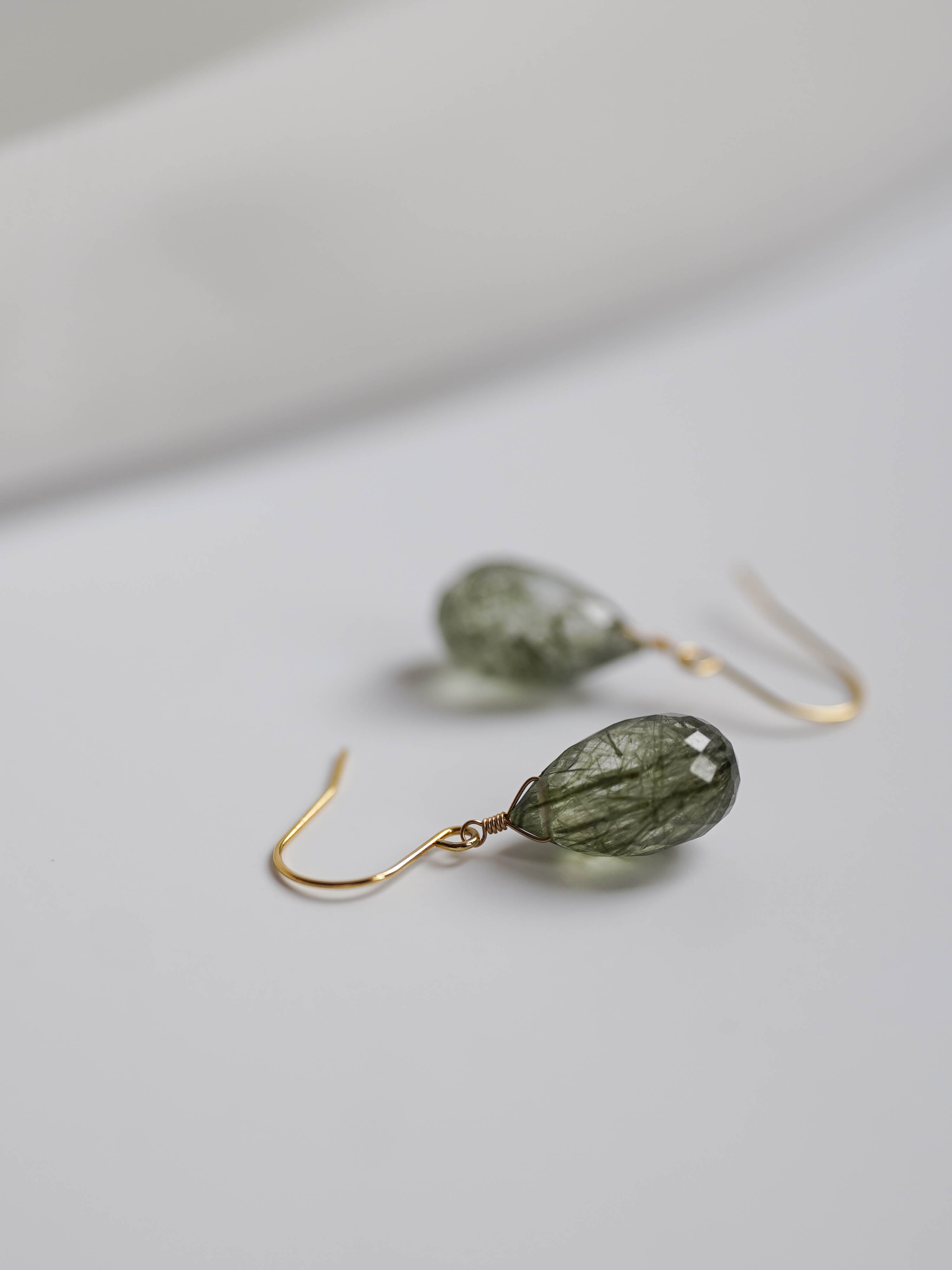 透明な水晶の中に緑色の細い針状鉱物が入った天然石グリーンルチルクォーツ。モスグリーンの針のような内包物はアクチノライトです。ランダムに入った針がアートのような模様を織り成し、落ち着いた大人っぽい印象に。大自然のアートを閉じ込めたような一石で見ているだけでもヒーリング効果があります。