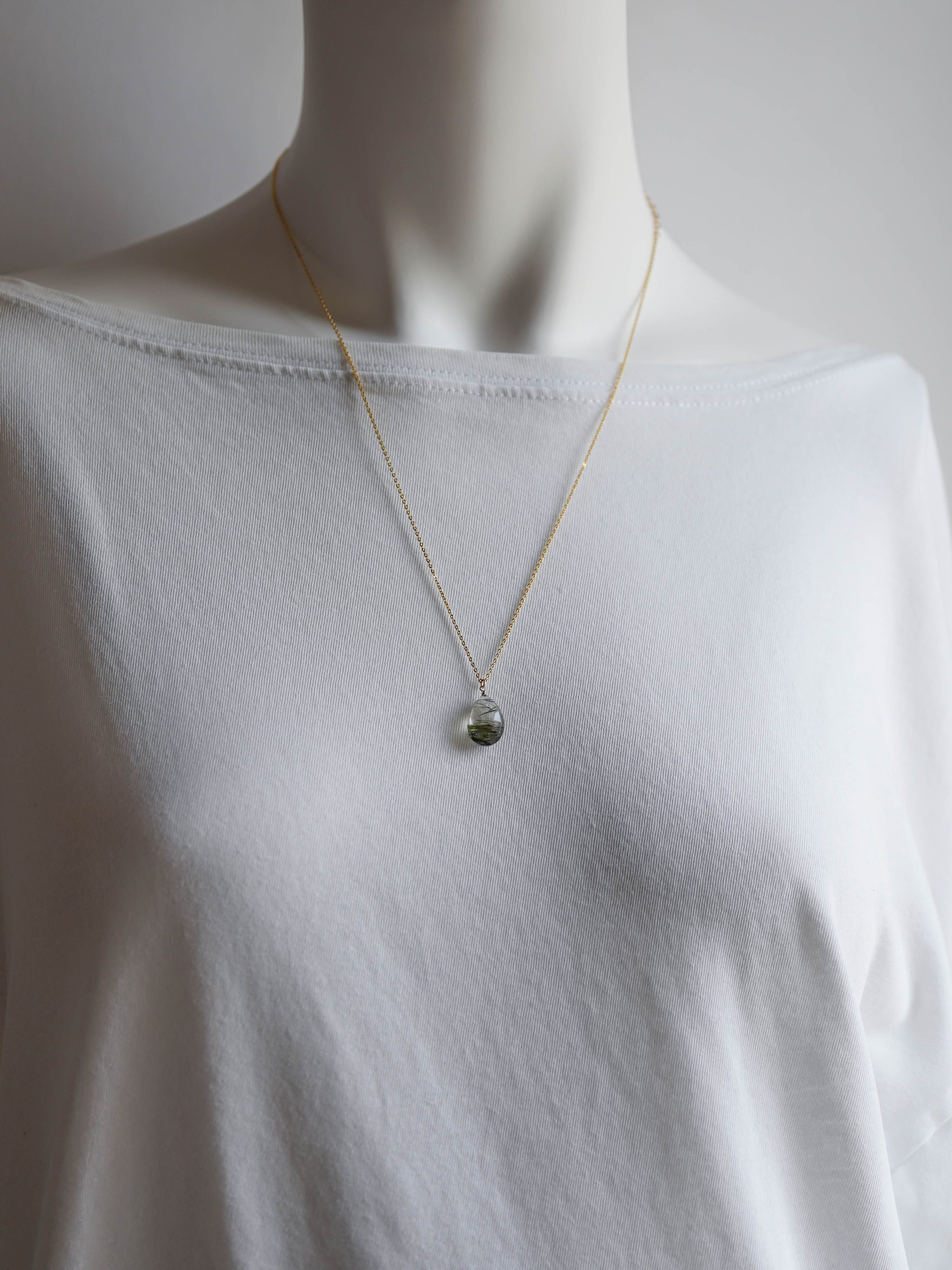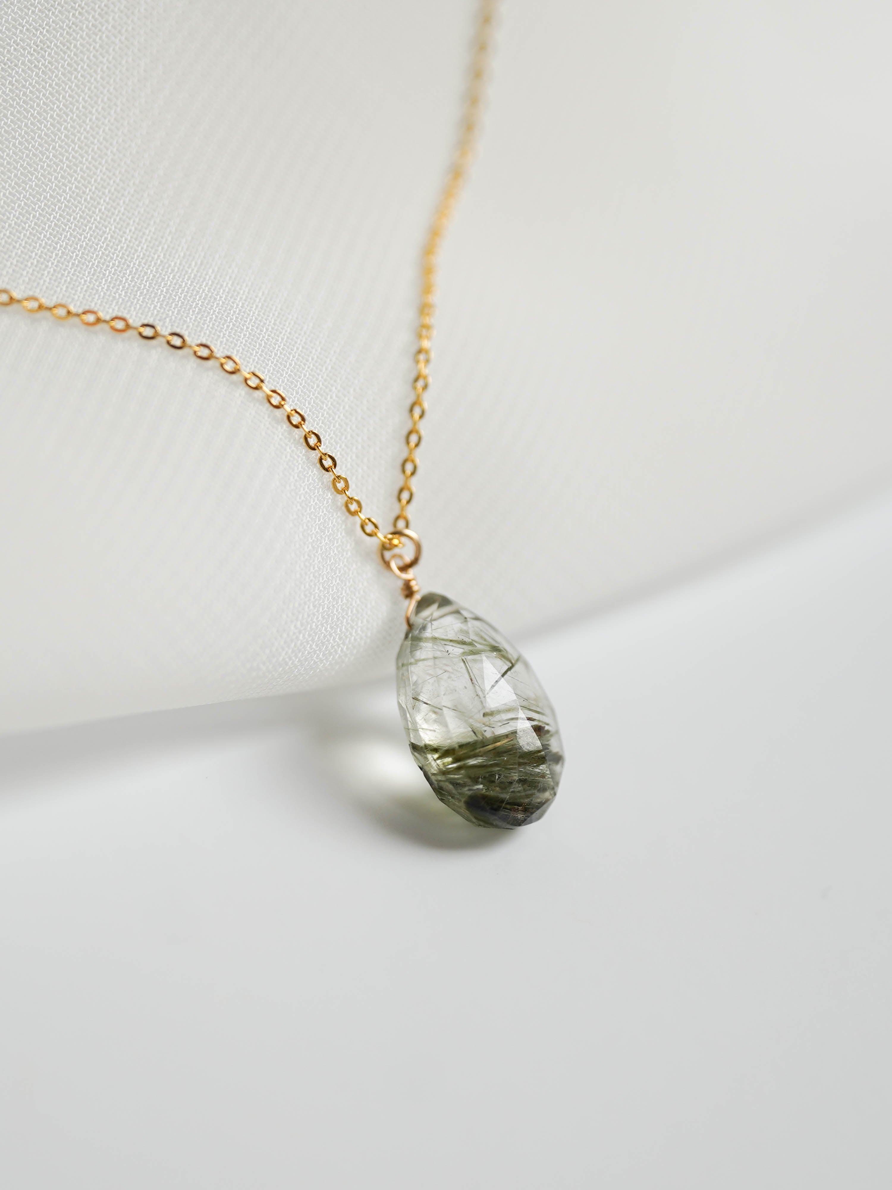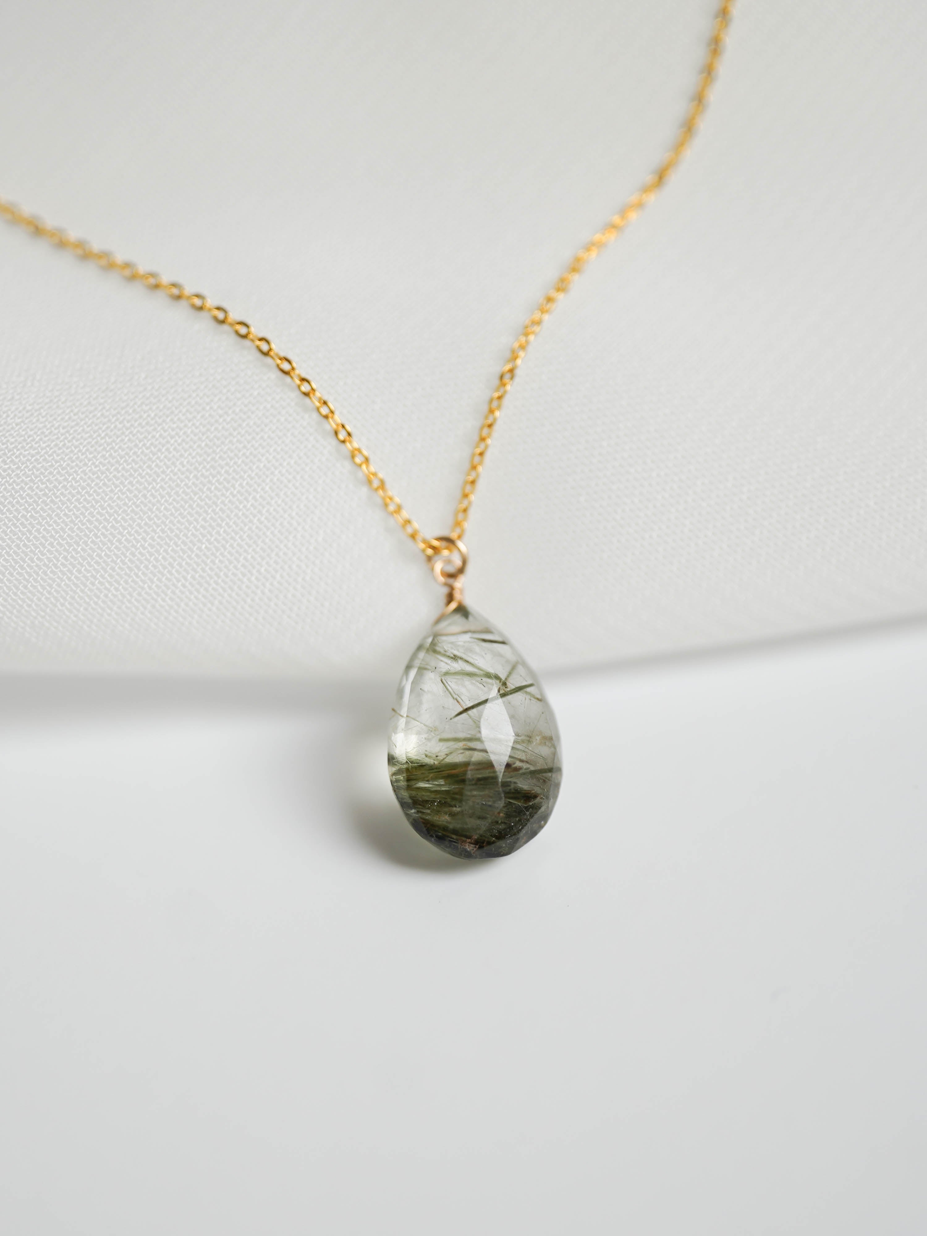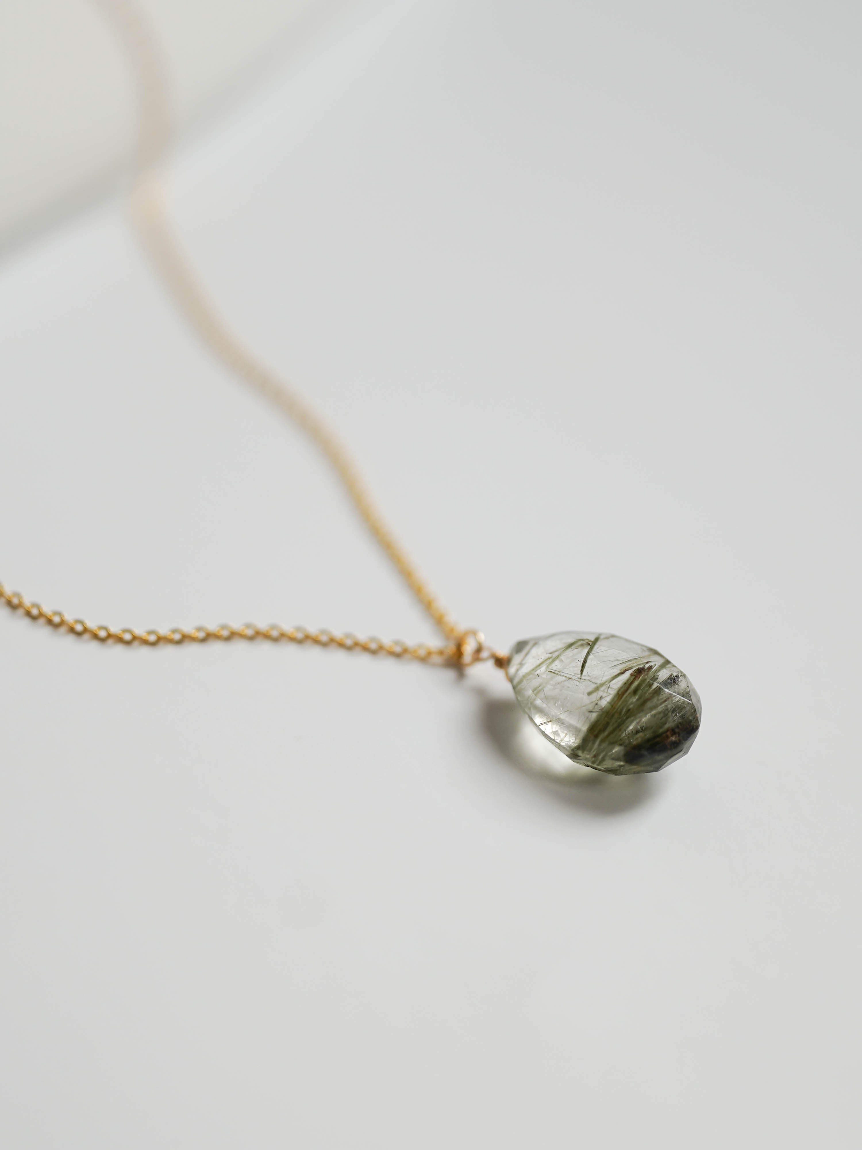 透明な水晶の中に緑色の細い針状鉱物が入った天然石グリーンルチルクォーツ。モスグリーンの針のような内包物はアクチノライトです。ランダムに入った針がアートのような模様を織り成し、落ち着いた大人っぽい印象に。大自然のアートを閉じ込めたような一石で見ているだけでもヒーリング効果があります。