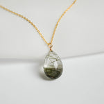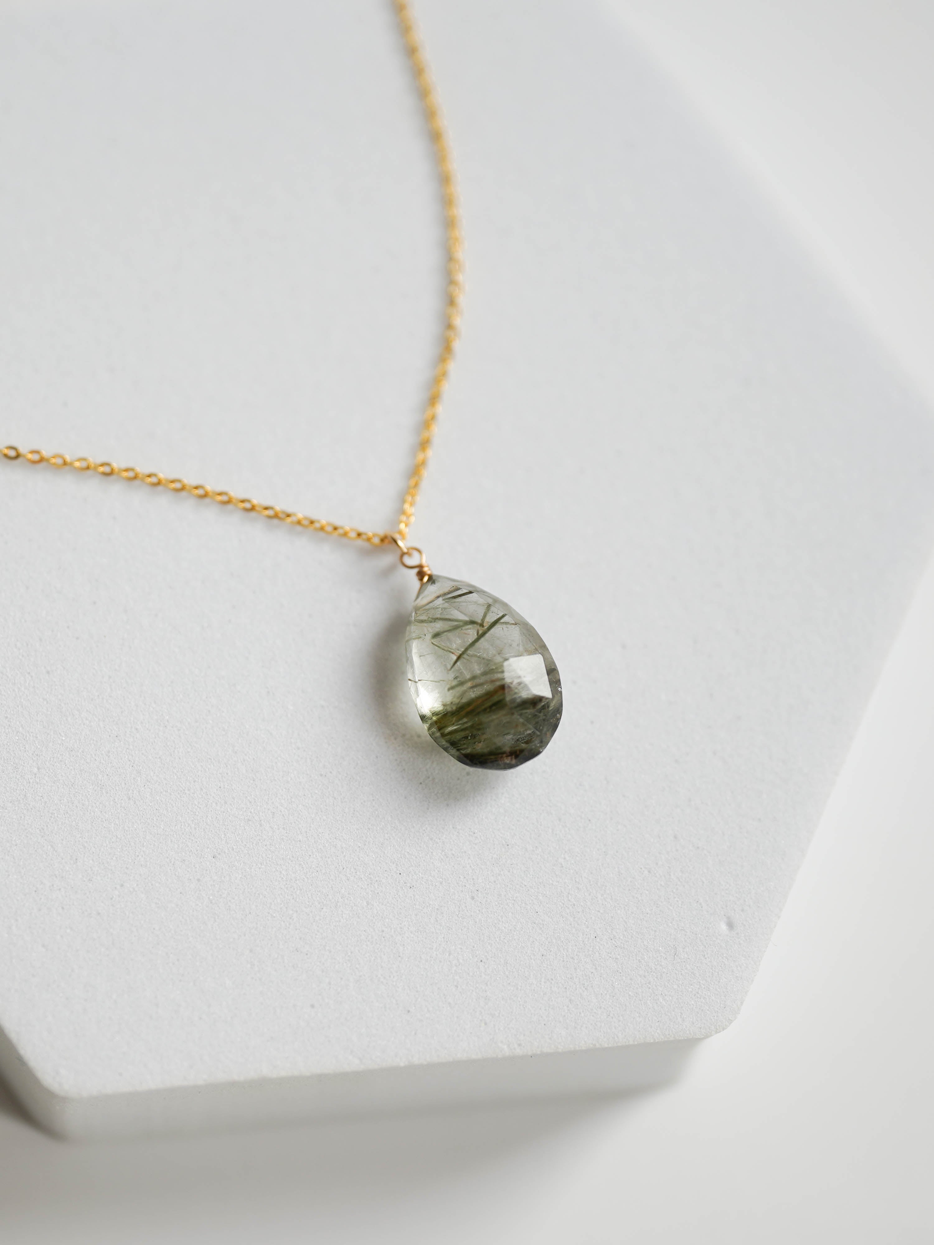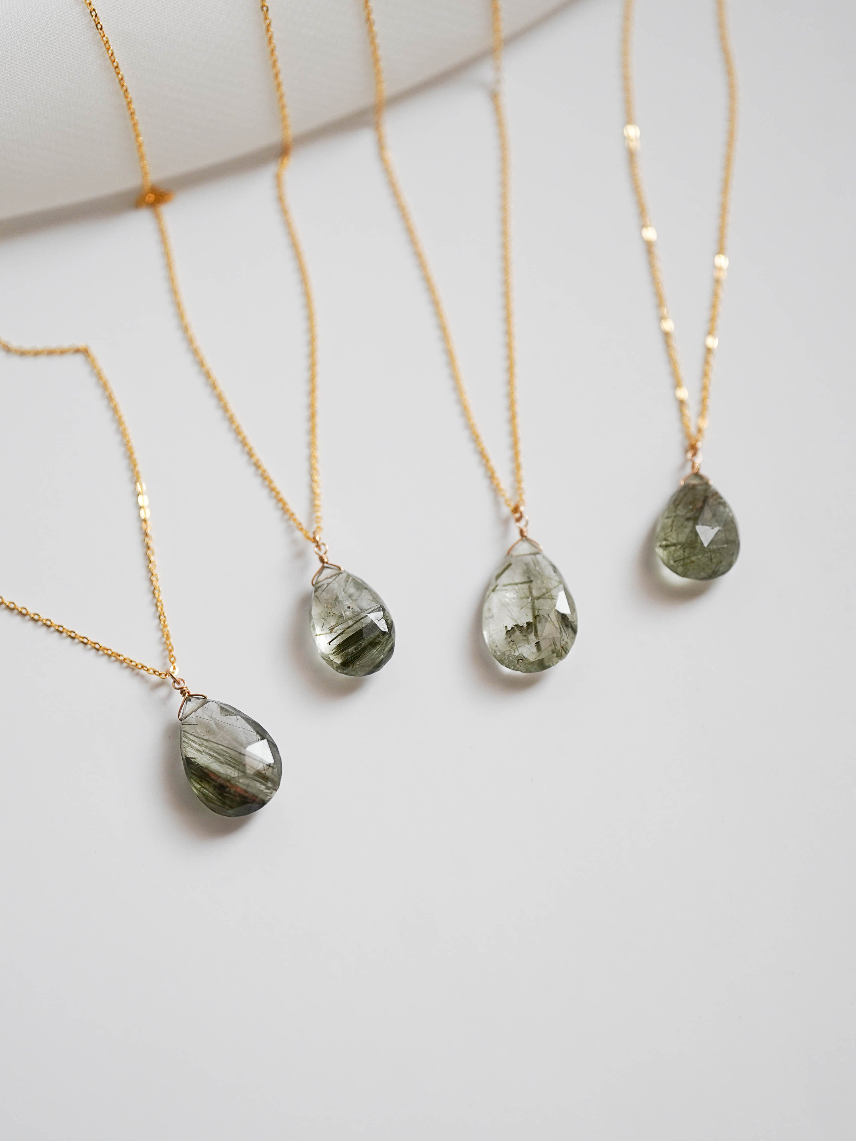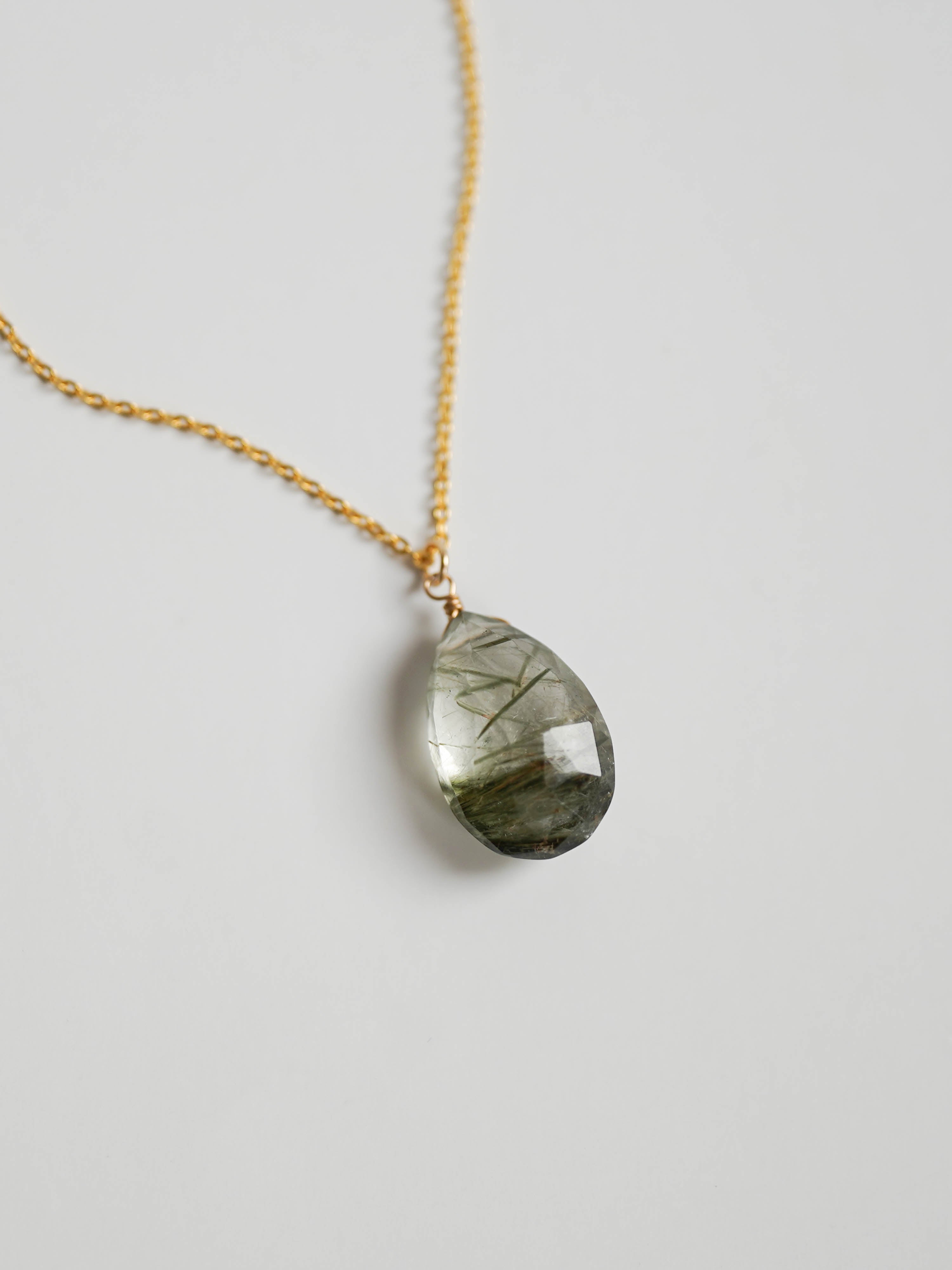 透明な水晶の中に緑色の細い針状鉱物が入った天然石グリーンルチルクォーツ。モスグリーンの針のような内包物はアクチノライトです。ランダムに入った針がアートのような模様を織り成し、落ち着いた大人っぽい印象に。大自然のアートを閉じ込めたような一石で見ているだけでもヒーリング効果があります。