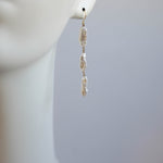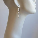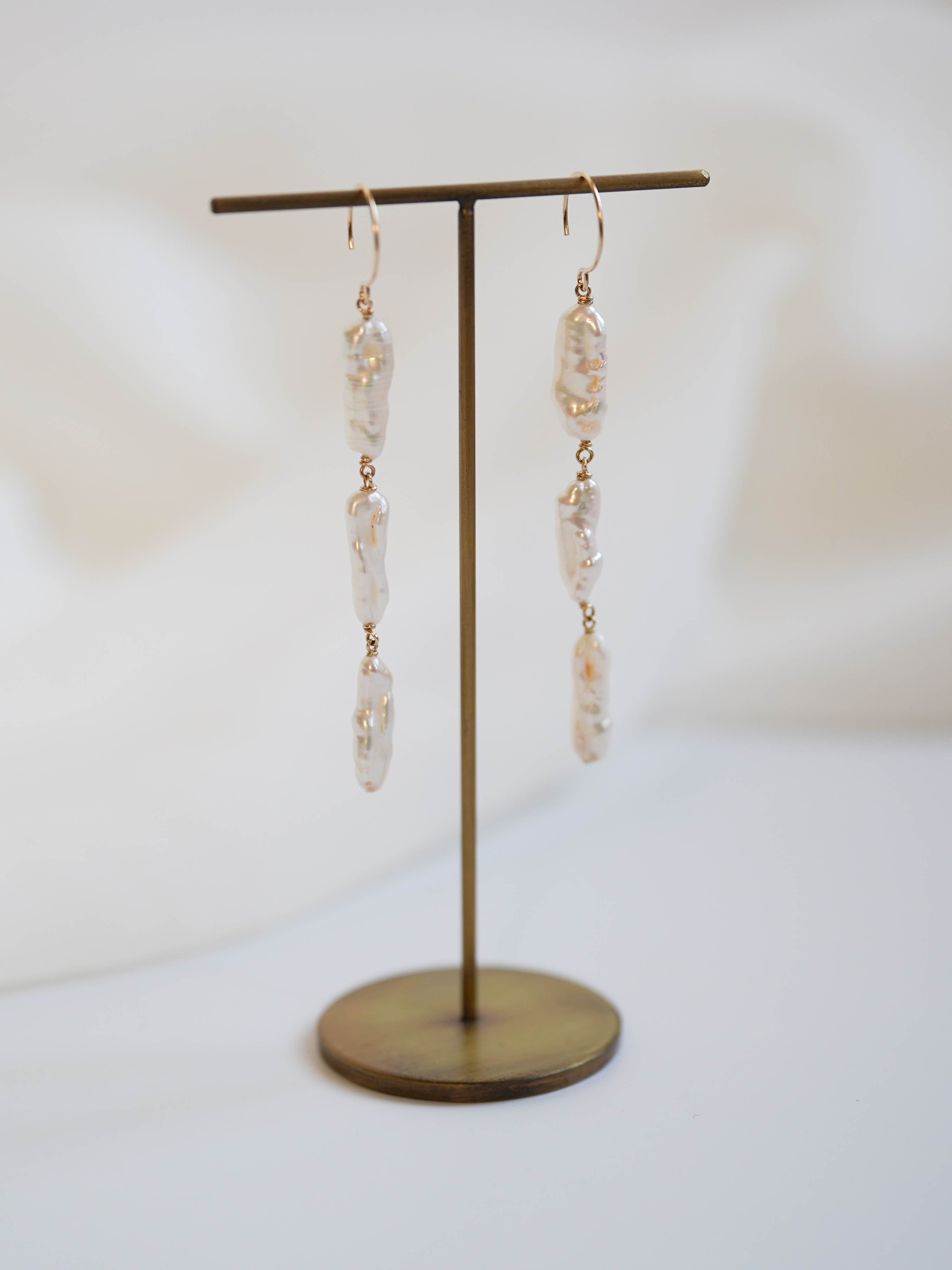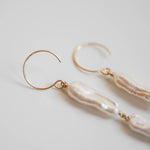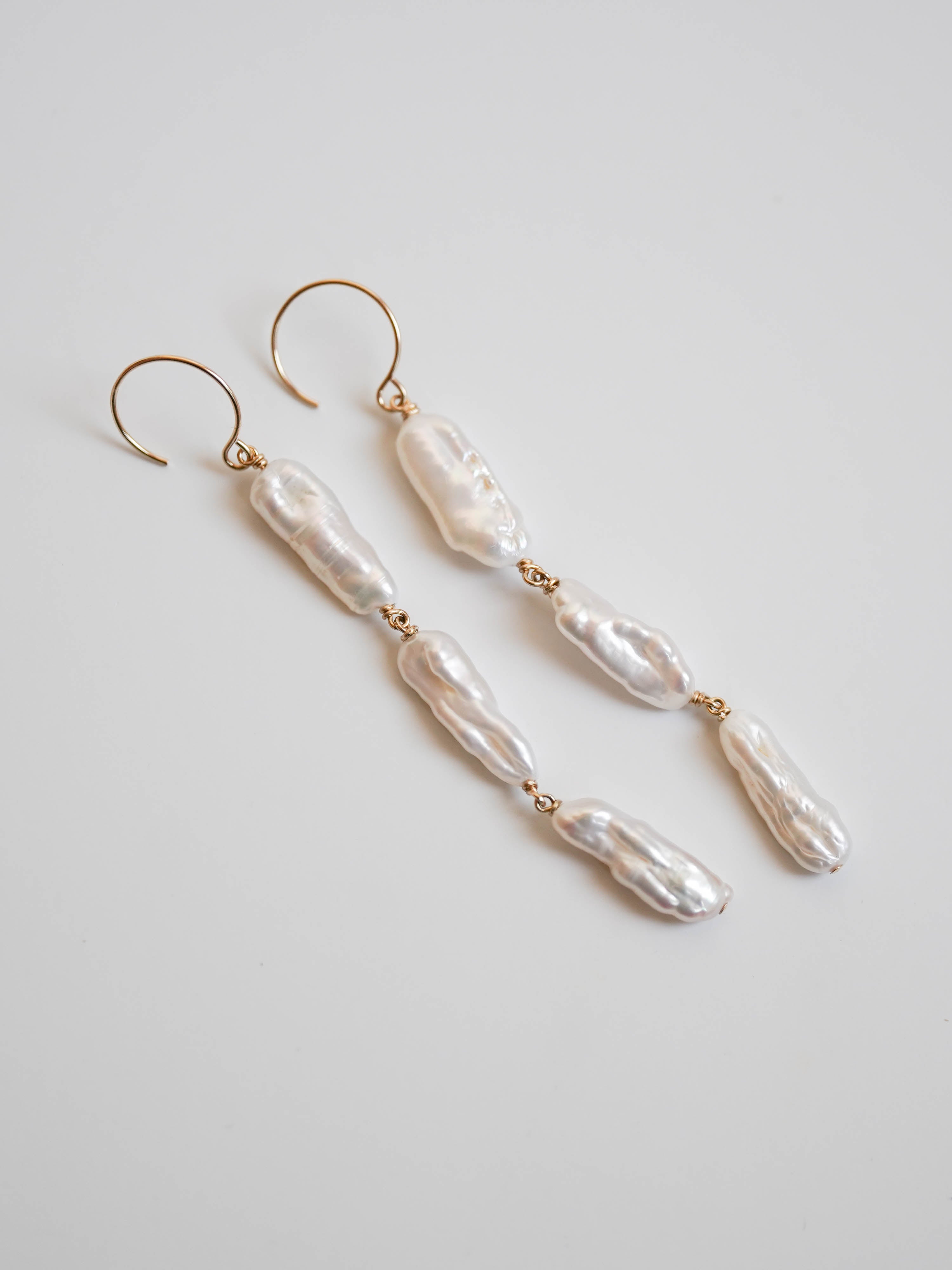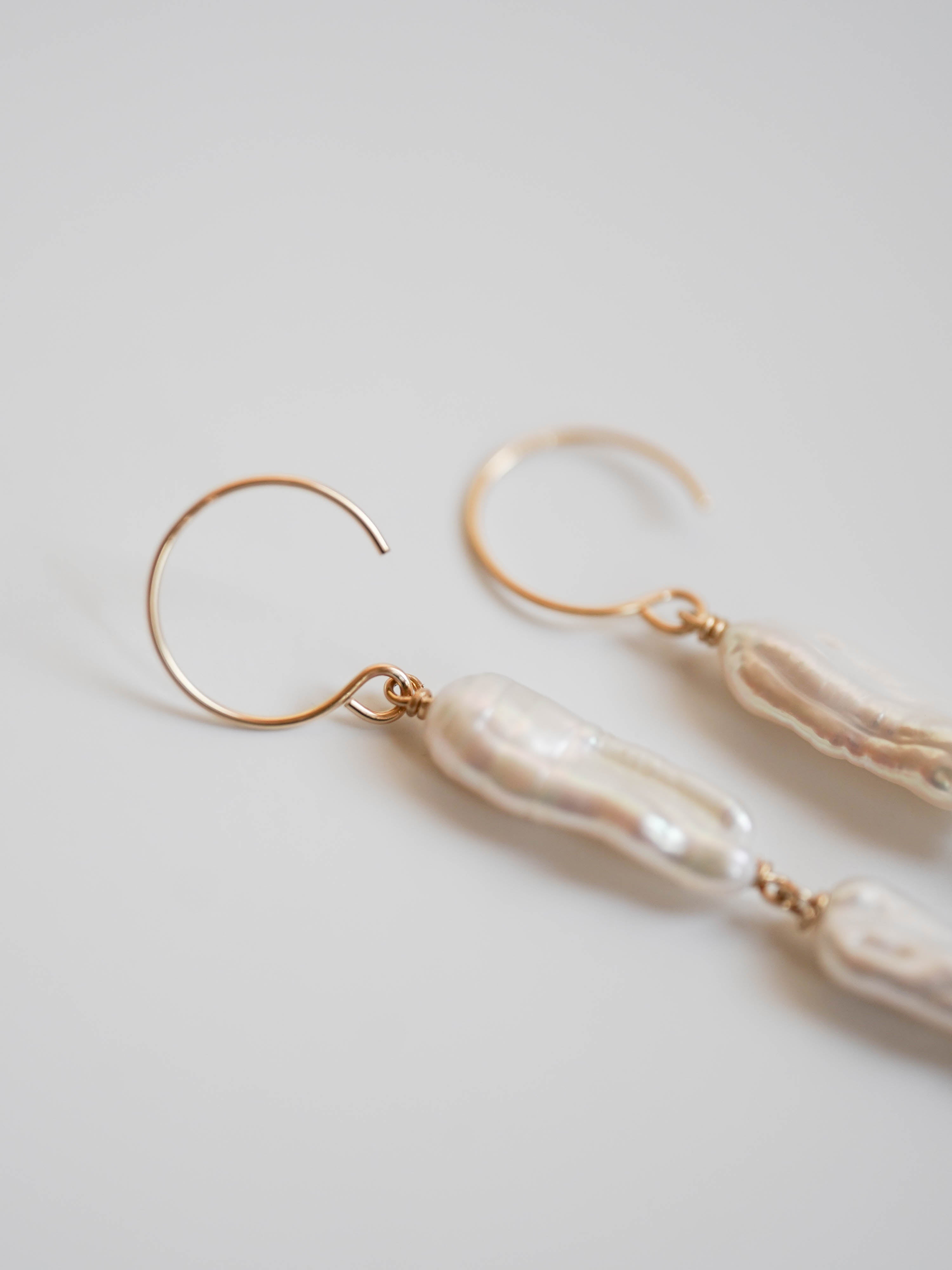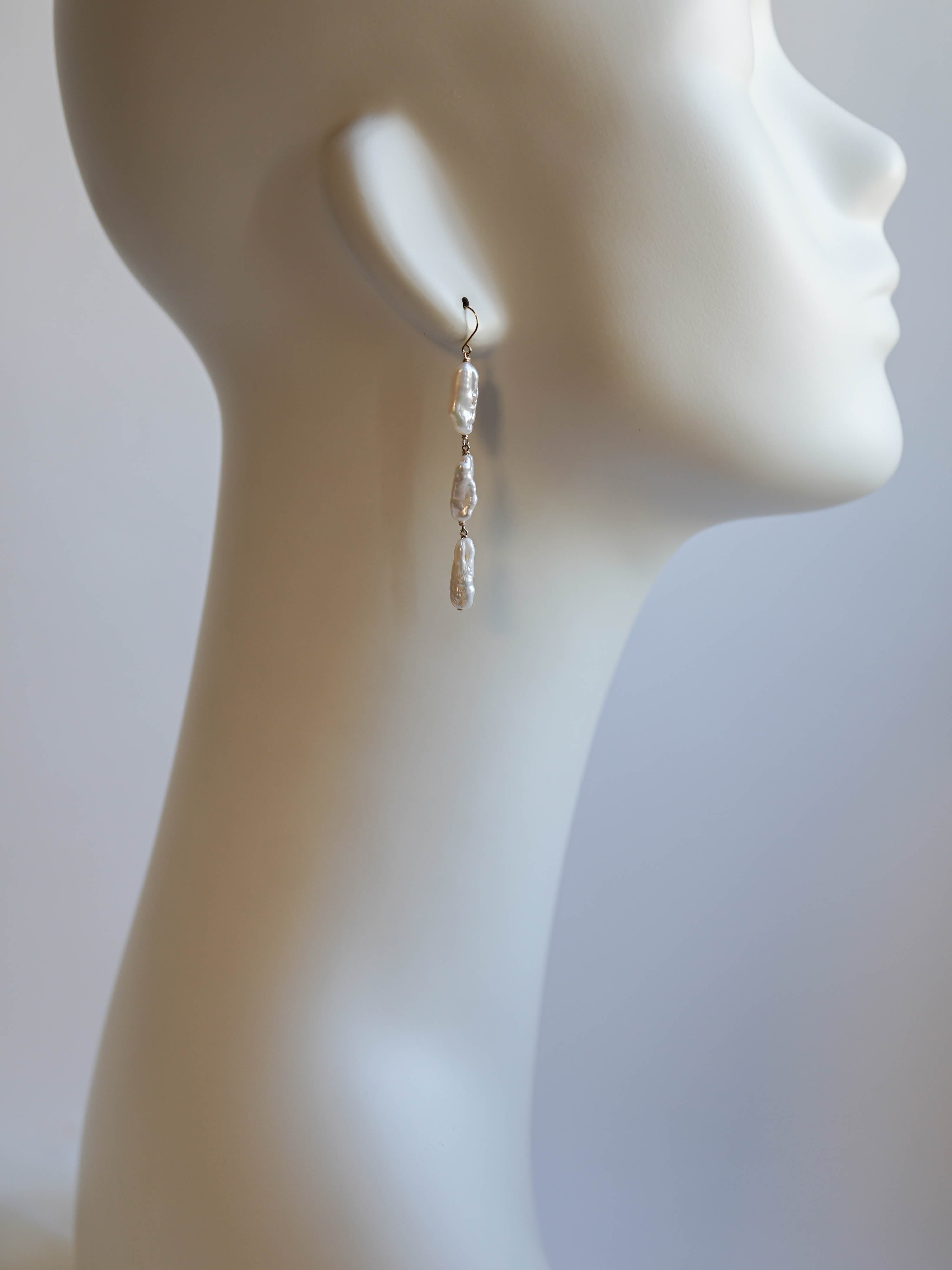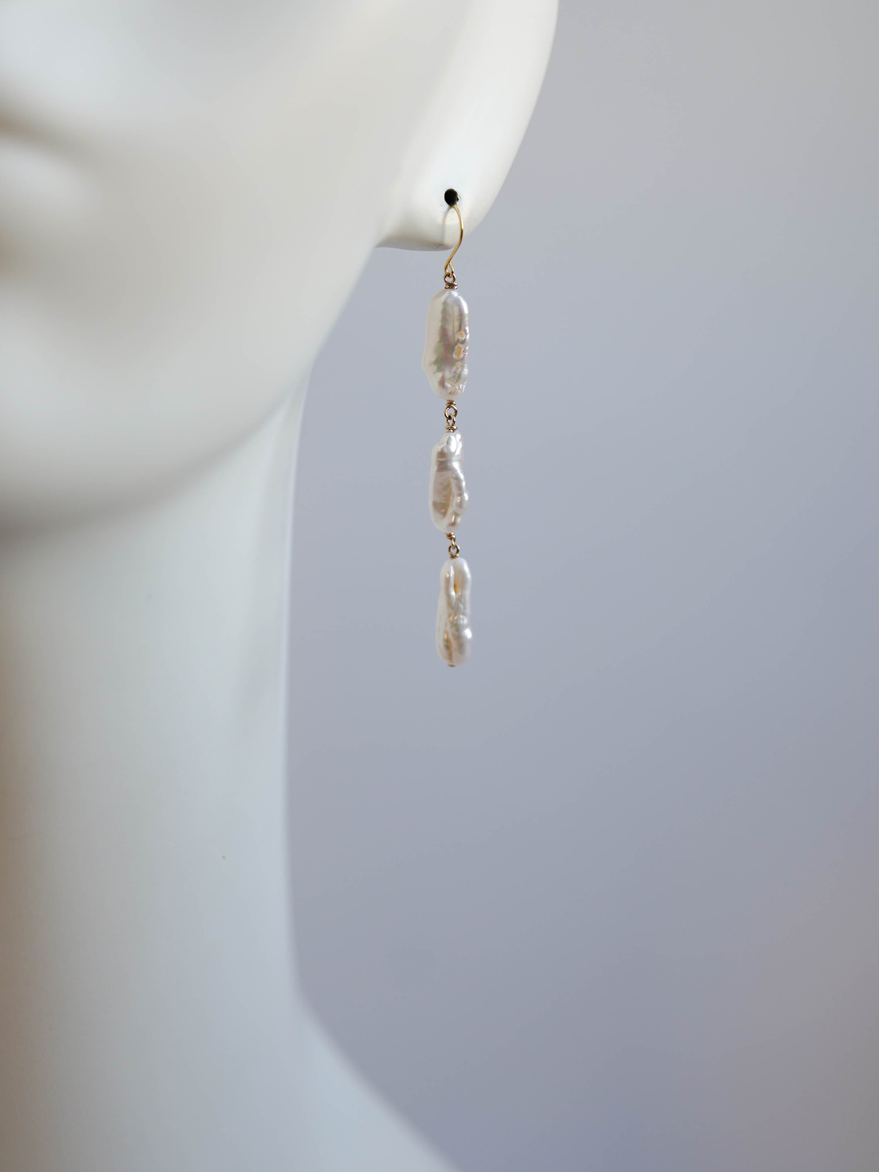 有機的な形が魅力のケシパールのピアスです。核を持たない無核真珠のため、自然に形成された個性的な形をしています。シルバーよりの白い光沢があるパールです。写真では自然光によりクリーム色のお色味に見えますが実物はホワイトです。やや虹色の干渉色もあり大変美しい粒を選びお仕立てしました。