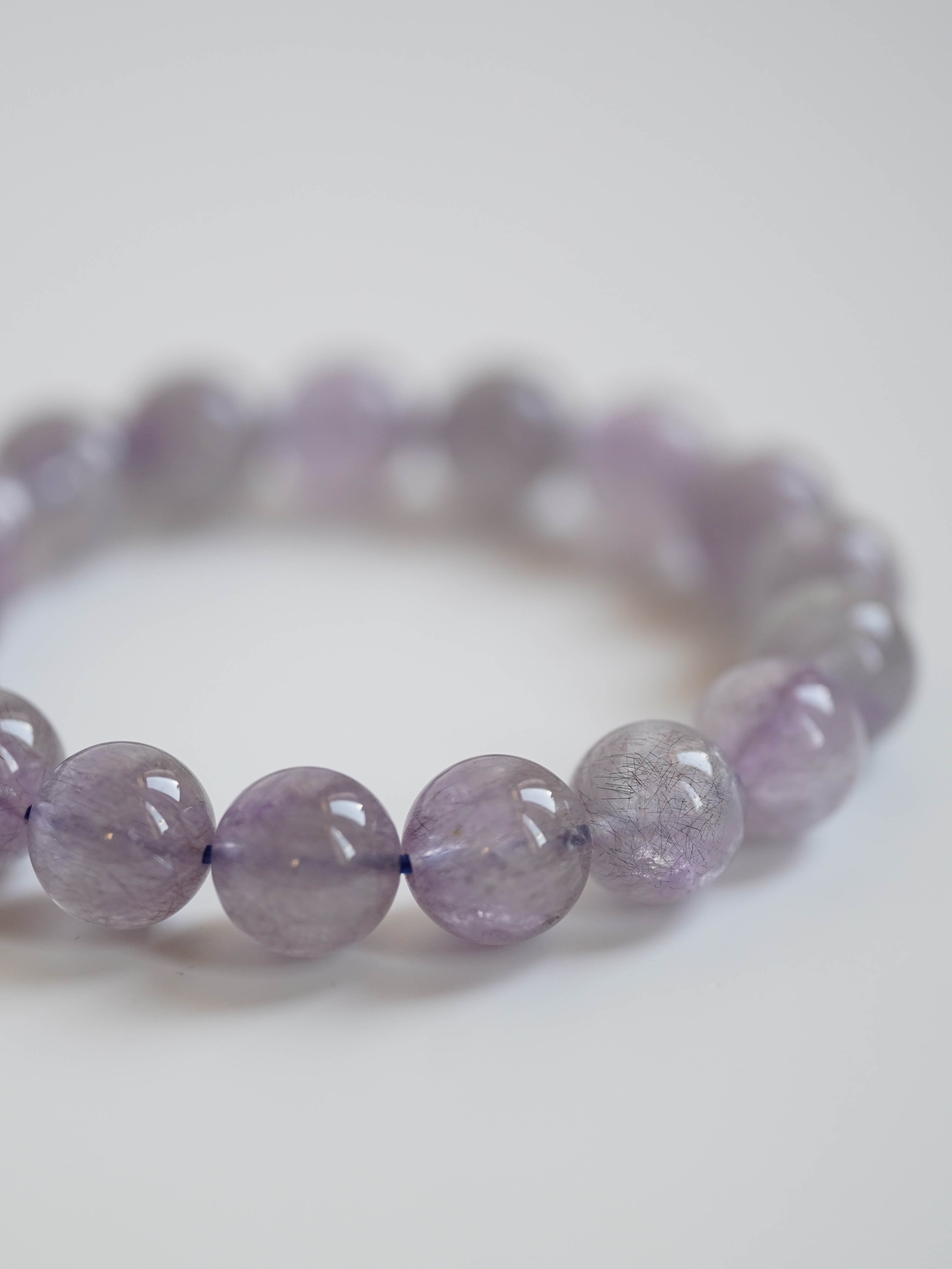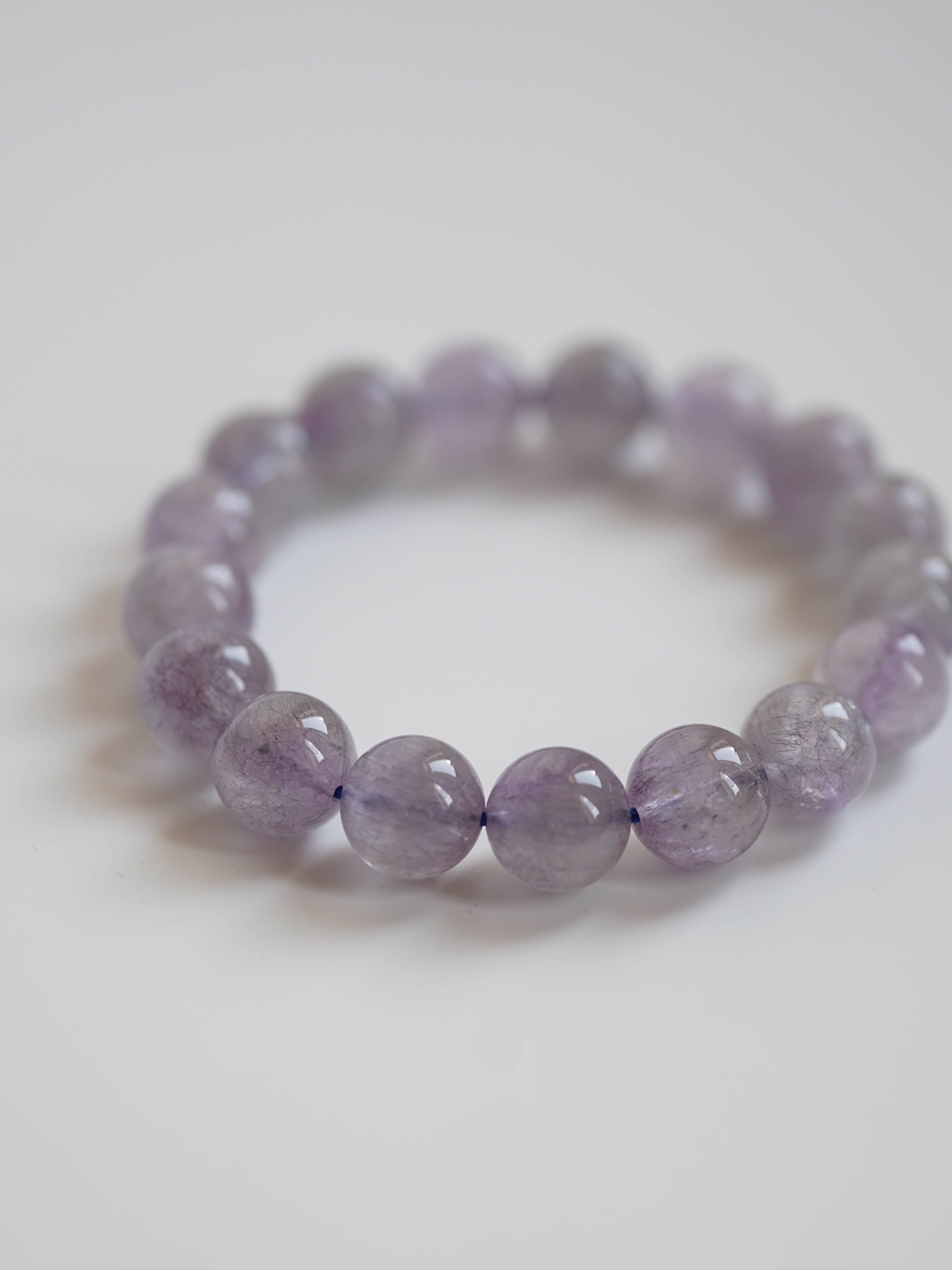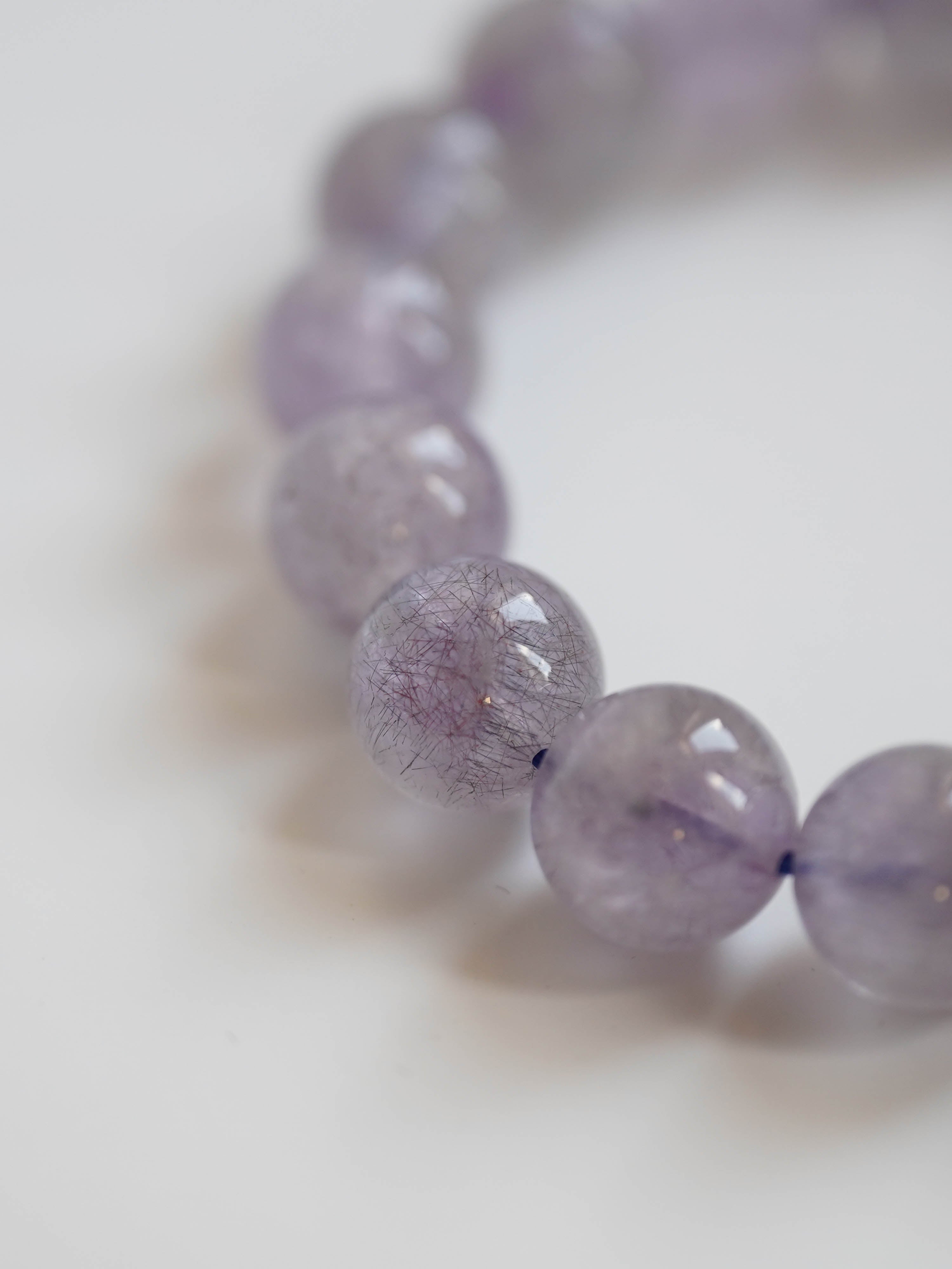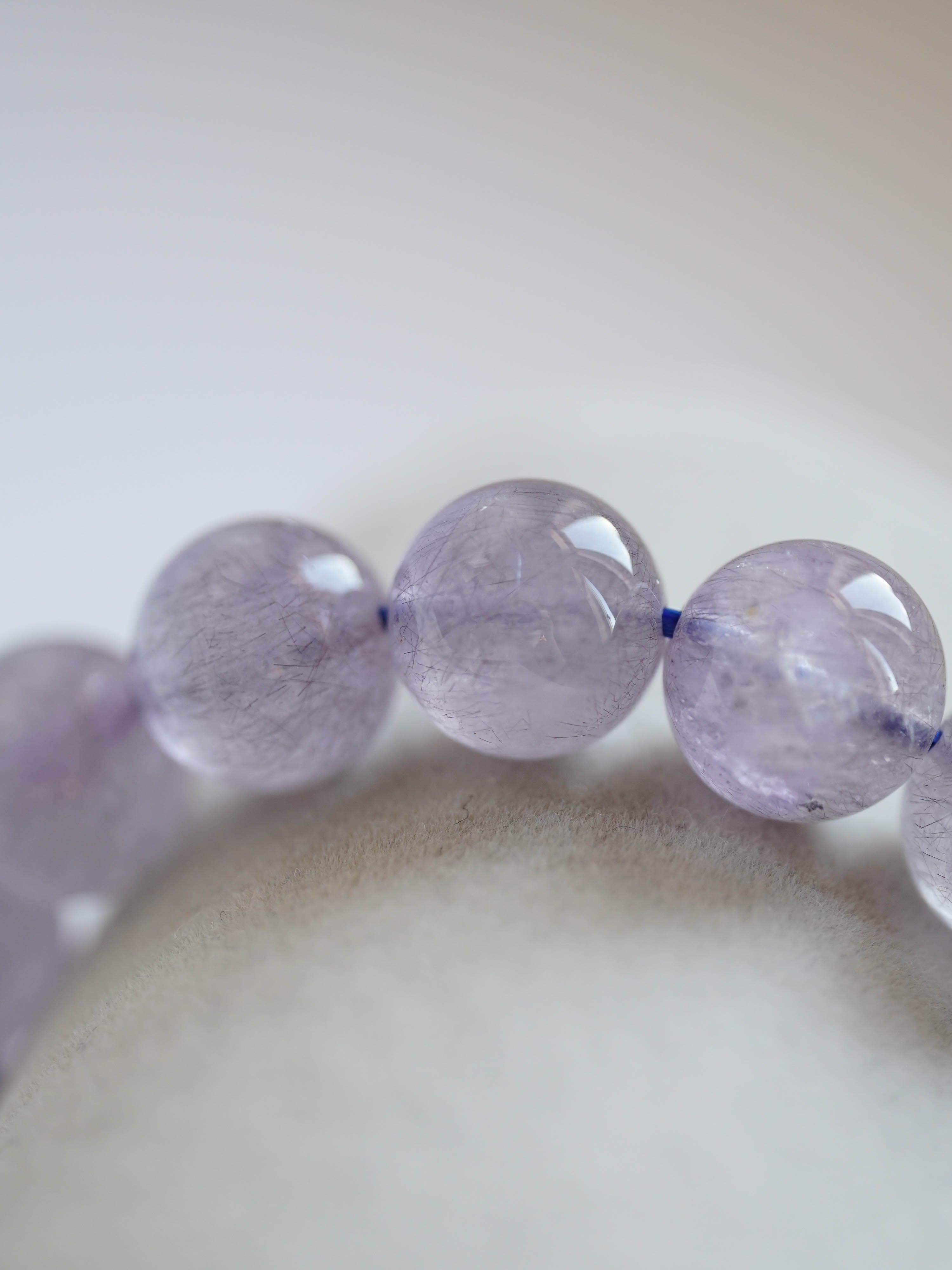 淡い紫色の結晶の中に青紫色のゲーサイトが内包された天然石ブルーパープルゲーサイトインクォーツです。絹糸のような針状鉱物がキラキラと細やかに輝く幻想的な天然石です。11mm玉とやや大きめで存在感のあるブレスレット。写真は自然光のもと撮影しているため、人工的な照明のもとでご覧いただくより透明感が増し明るく見えます。天然石の色の変化をお手元でぜひご覧ください。