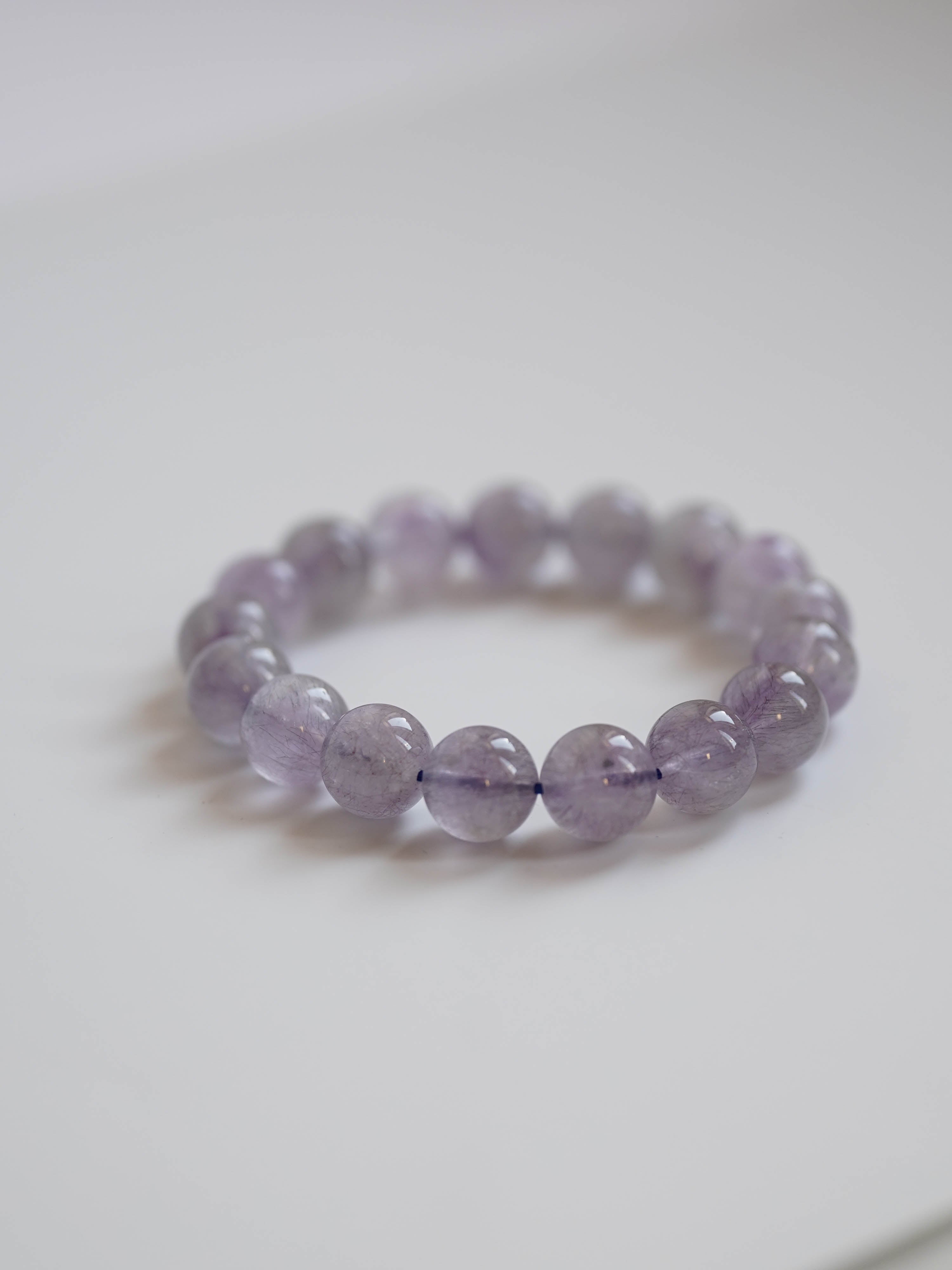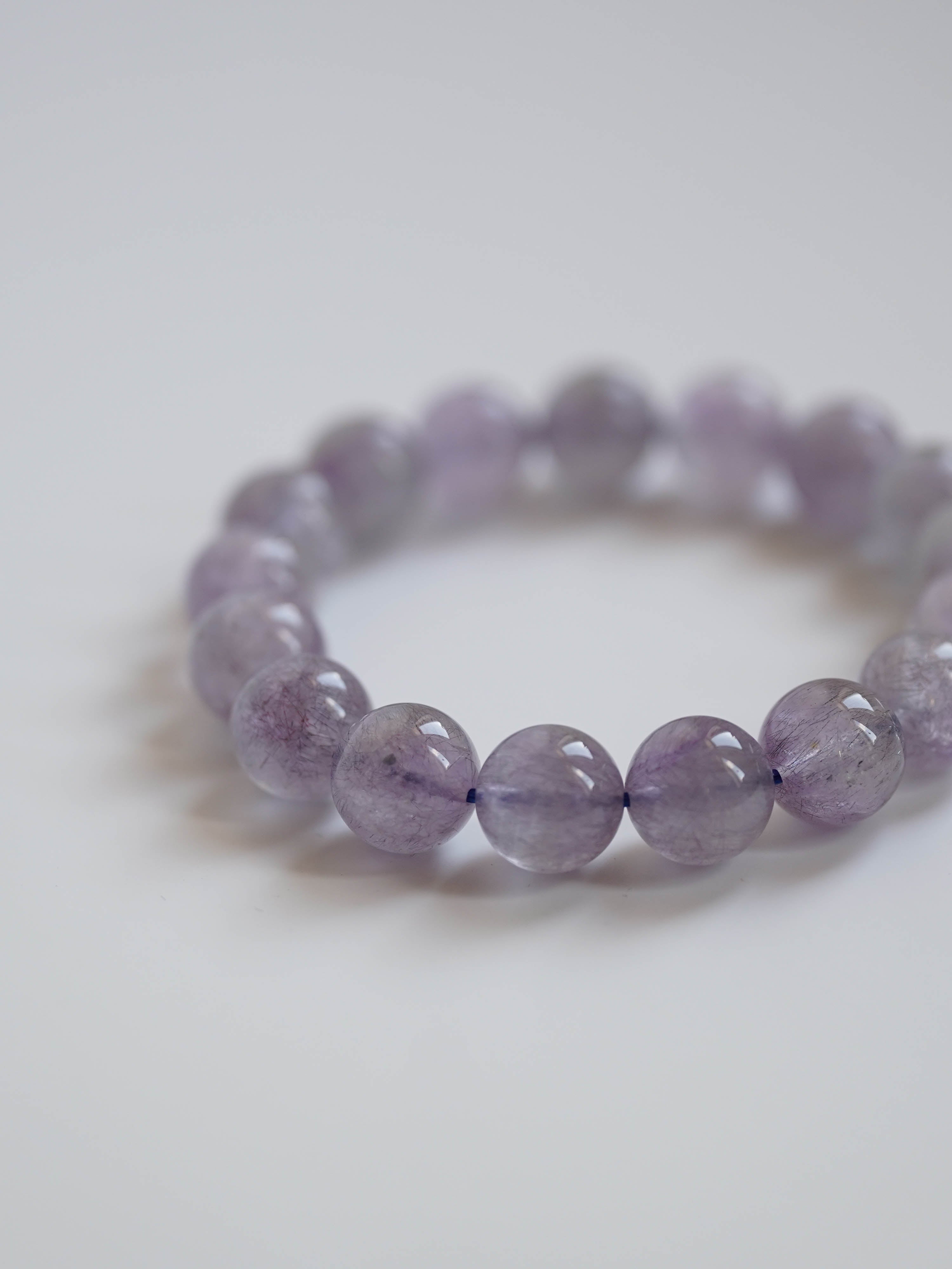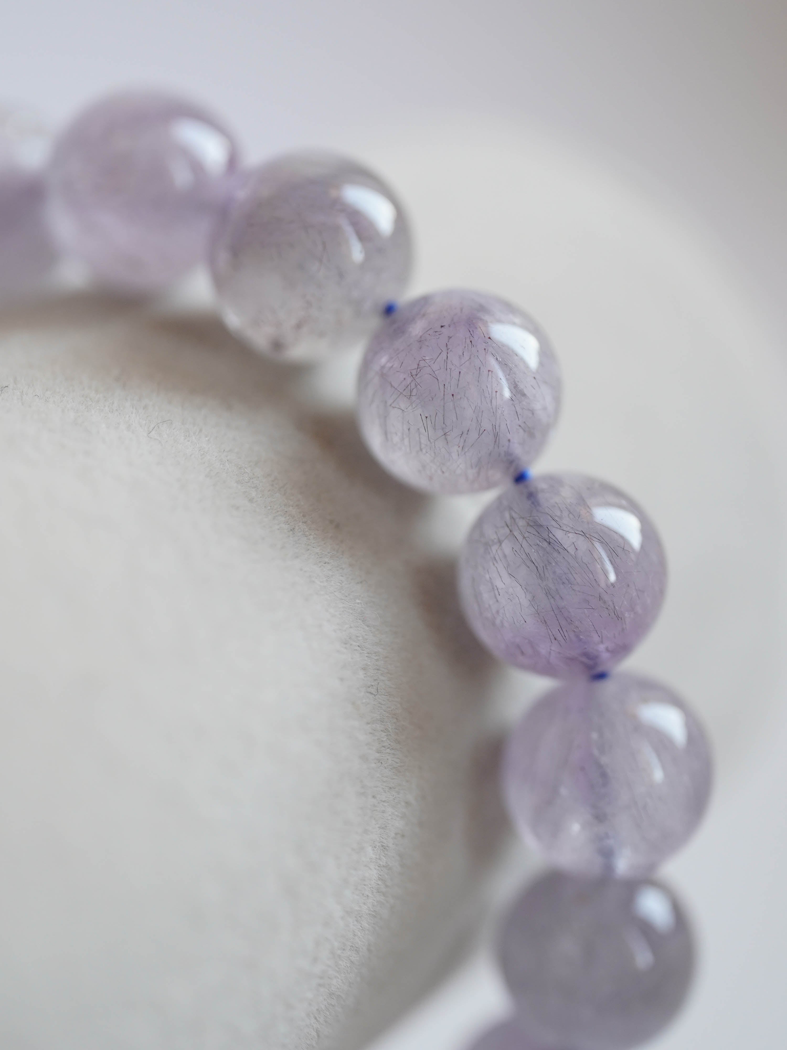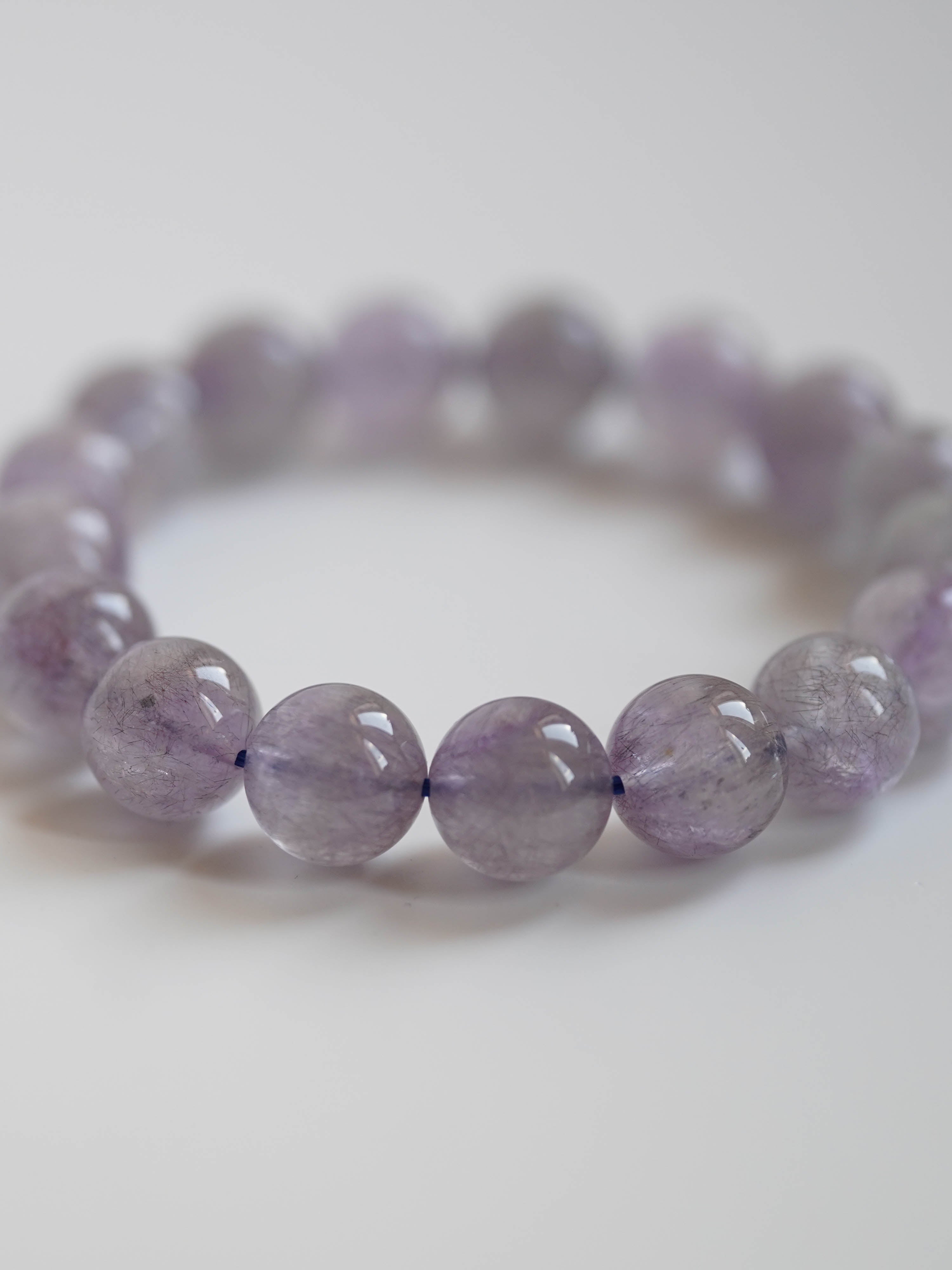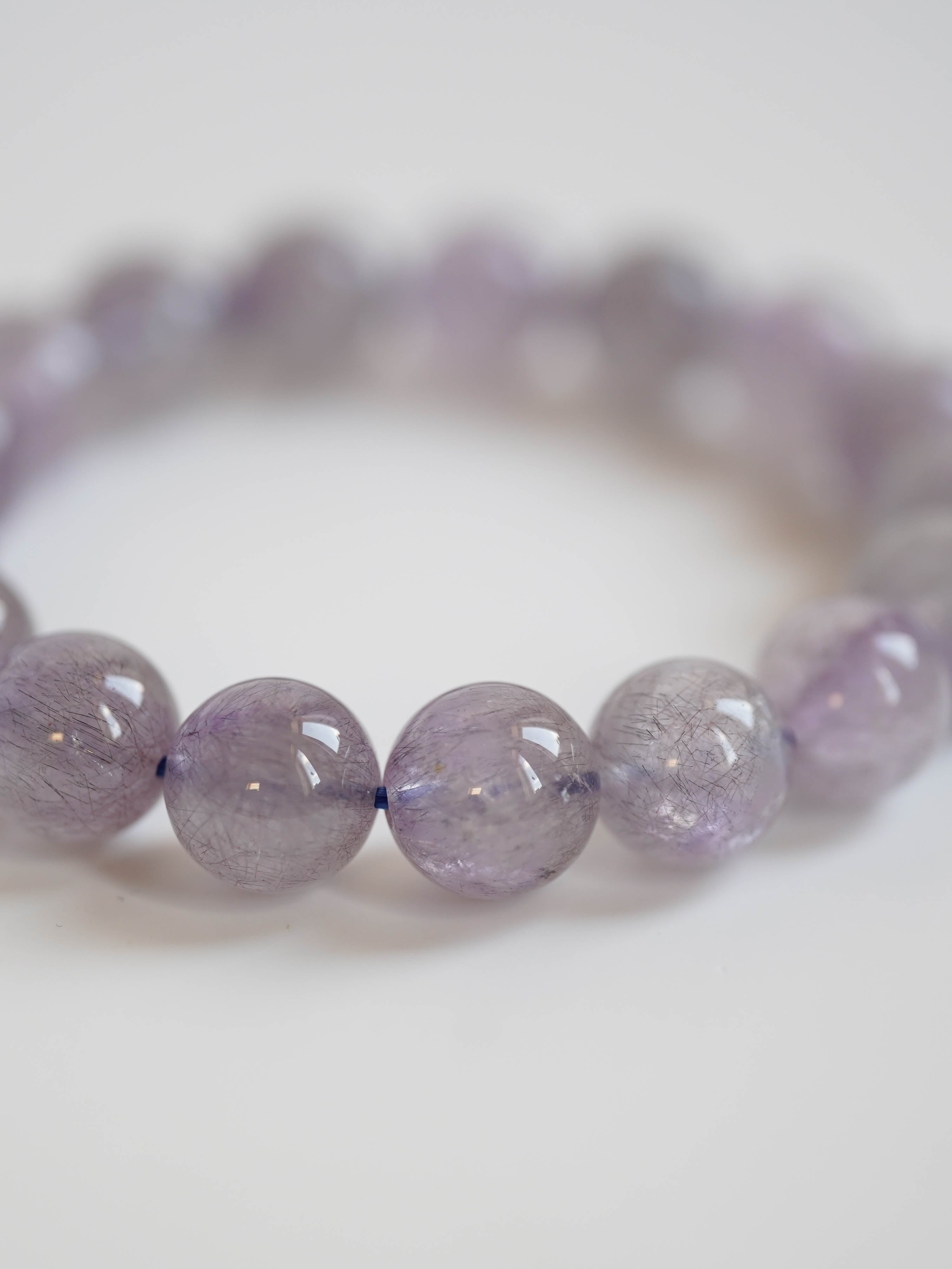 淡い紫色の結晶の中に青紫色のゲーサイトが内包された天然石ブルーパープルゲーサイトインクォーツです。絹糸のような針状鉱物がキラキラと細やかに輝く幻想的な天然石です。11mm玉とやや大きめで存在感のあるブレスレット。写真は自然光のもと撮影しているため、人工的な照明のもとでご覧いただくより透明感が増し明るく見えます。天然石の色の変化をお手元でぜひご覧ください。