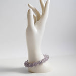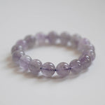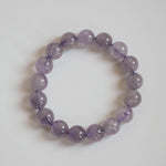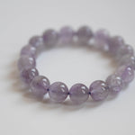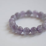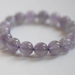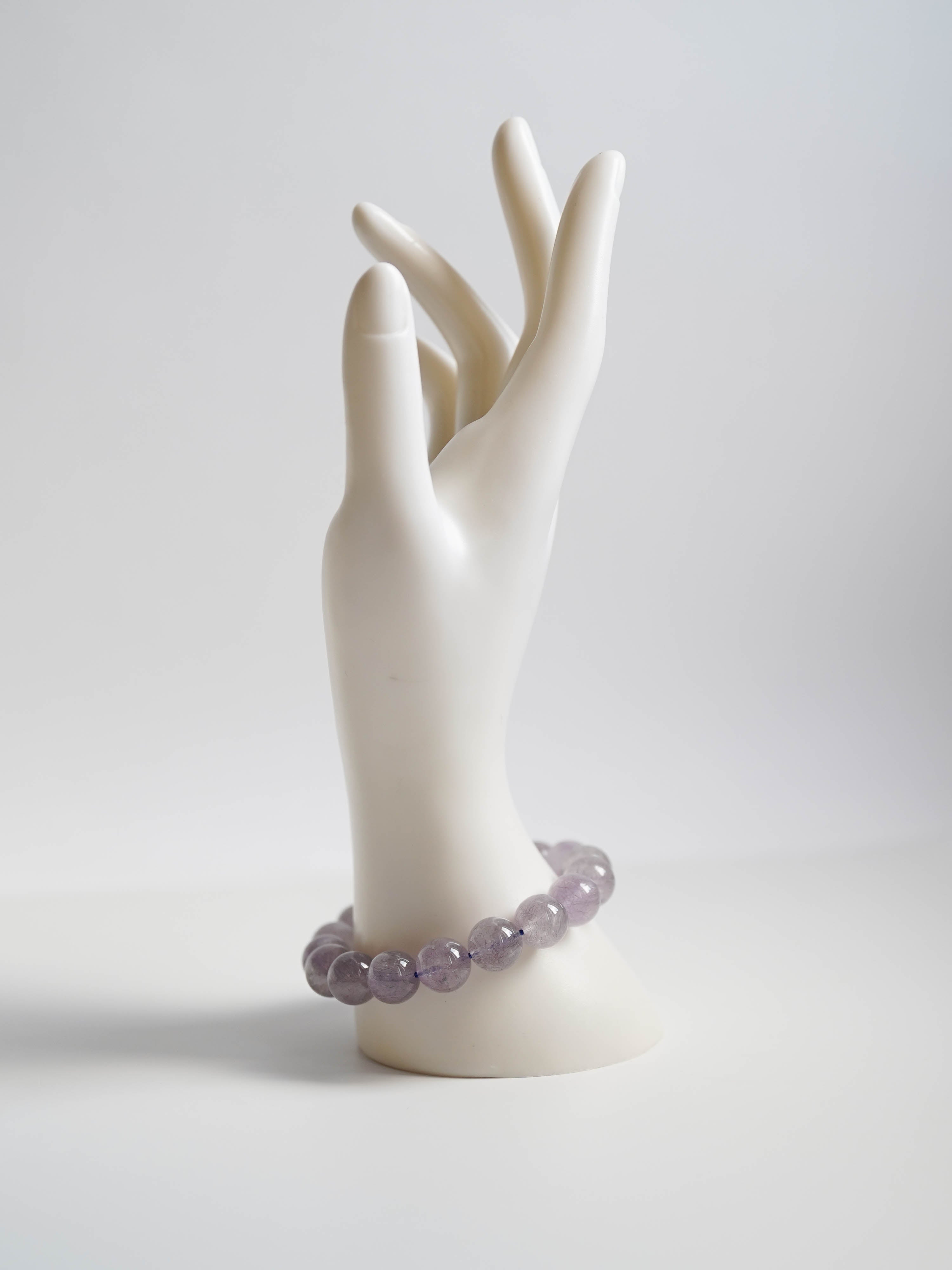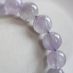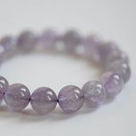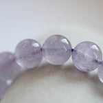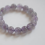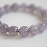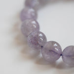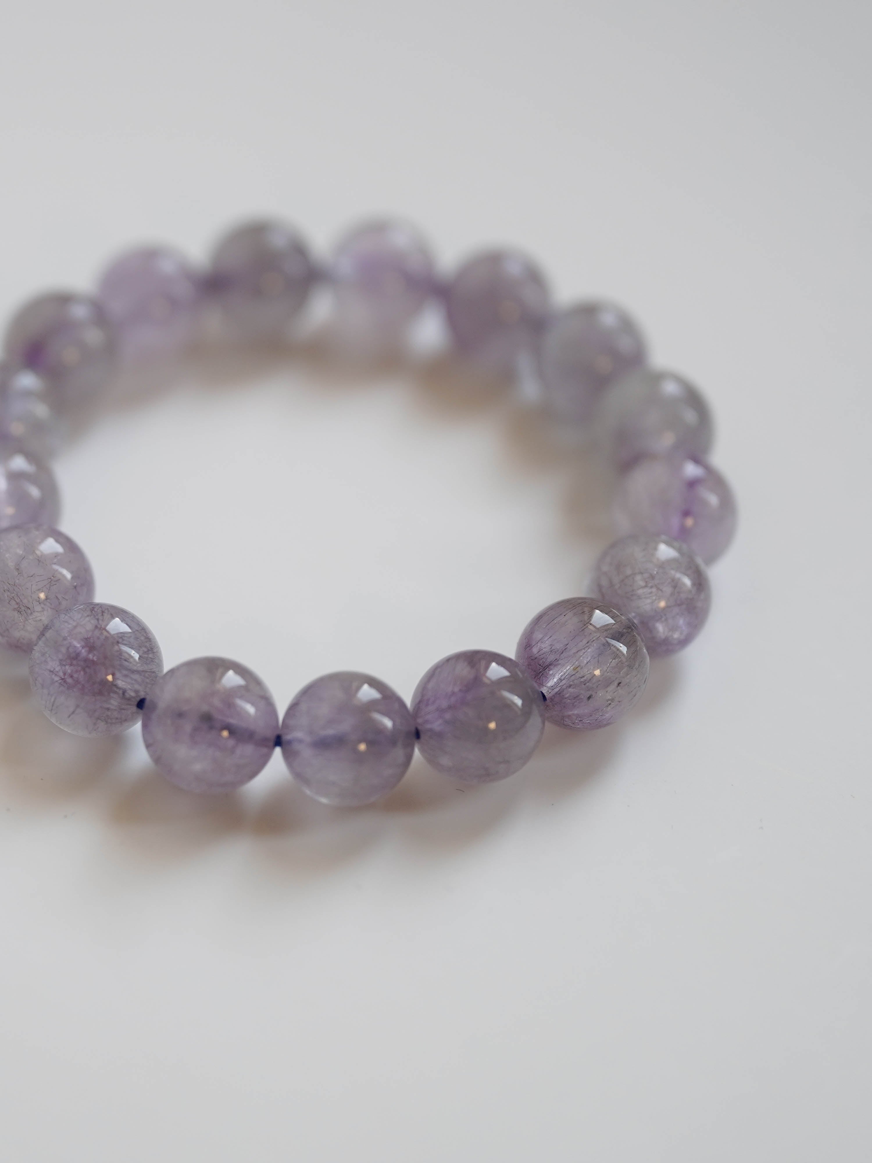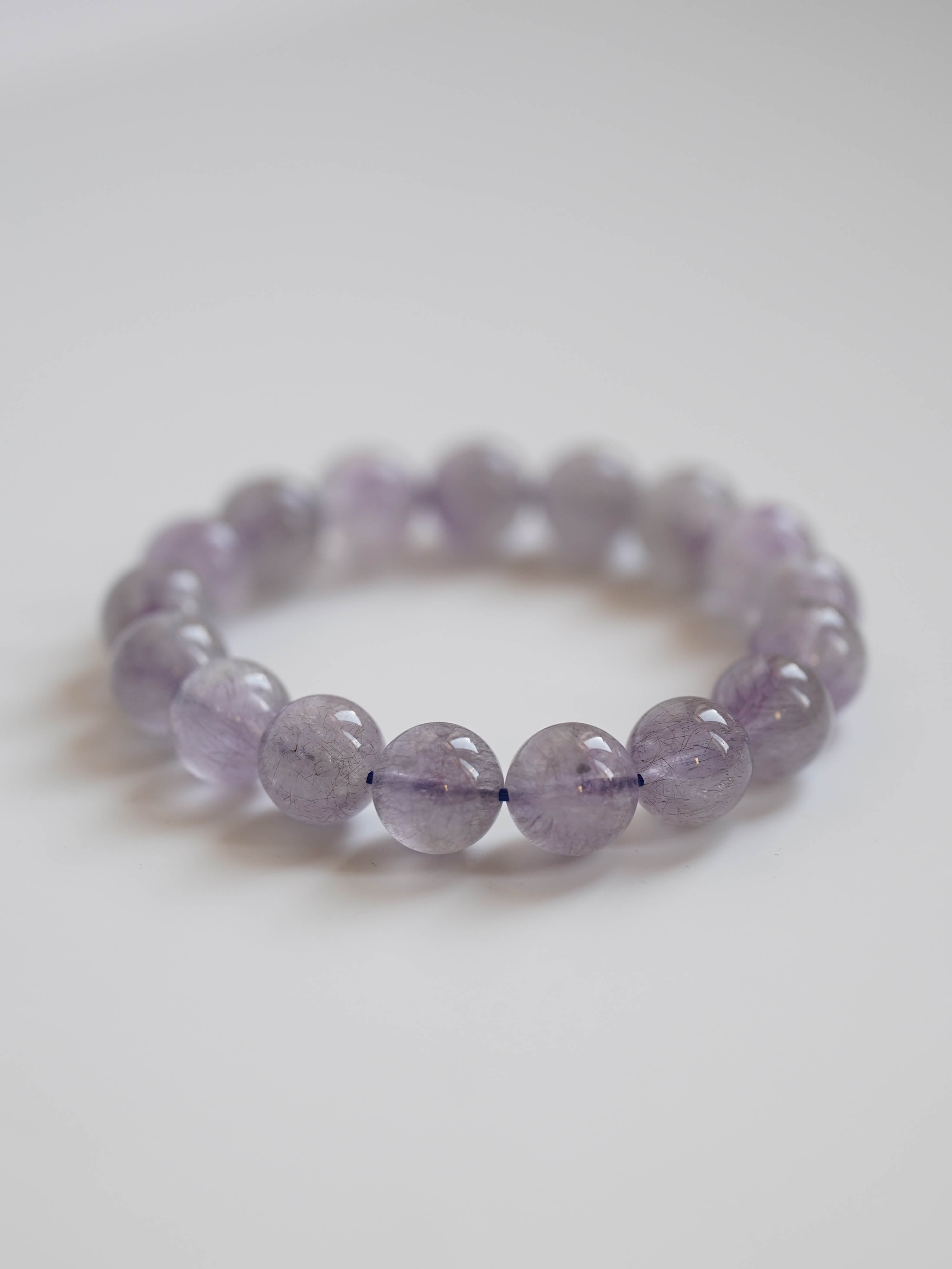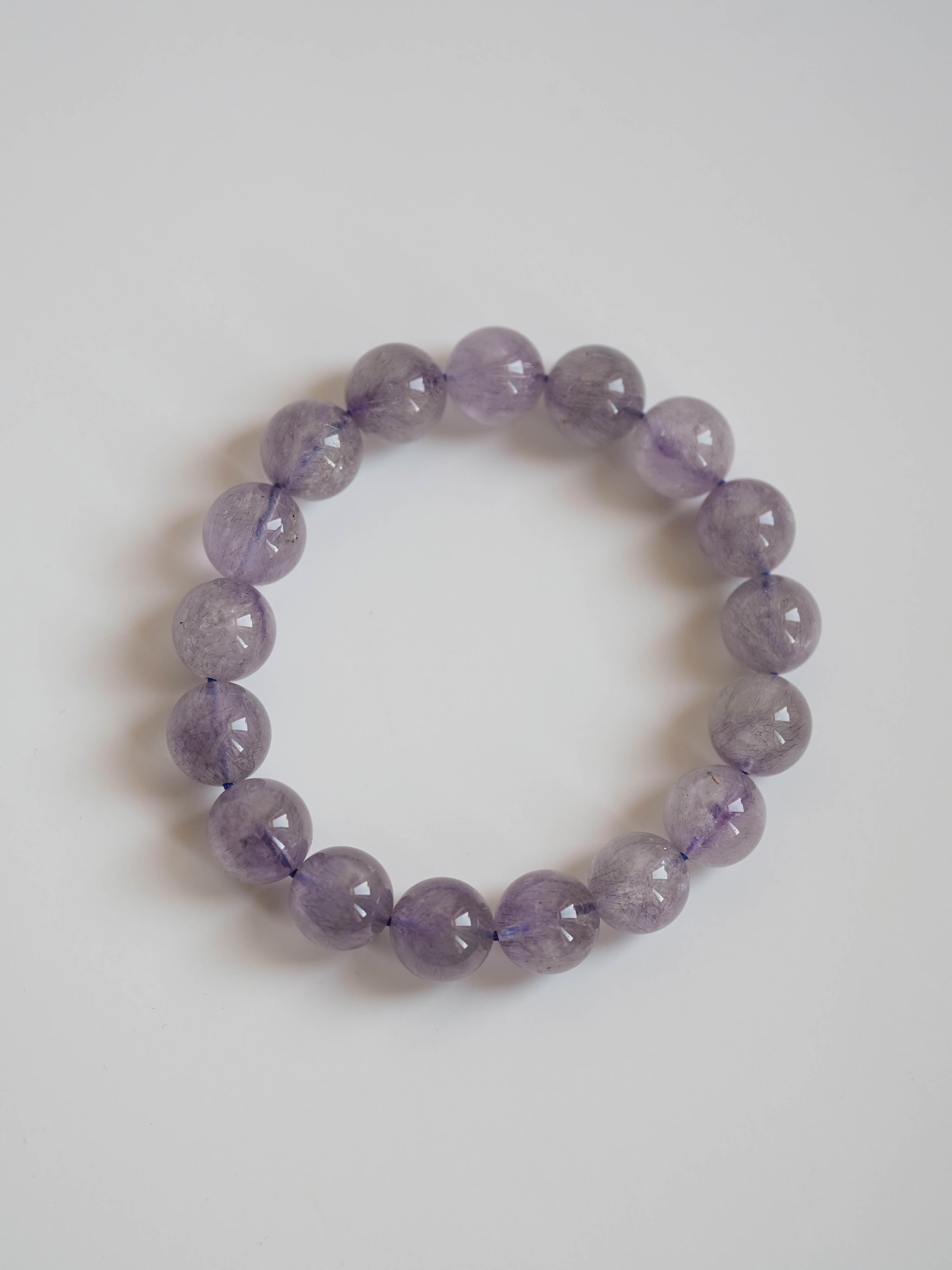 淡い紫色の結晶の中に青紫色のゲーサイトが内包された天然石ブルーパープルゲーサイトインクォーツです。絹糸のような針状鉱物がキラキラと細やかに輝く幻想的な天然石です。11mm玉とやや大きめで存在感のあるブレスレット。写真は自然光のもと撮影しているため、人工的な照明のもとでご覧いただくより透明感が増し明るく見えます。天然石の色の変化をお手元でぜひご覧ください。