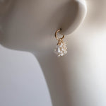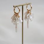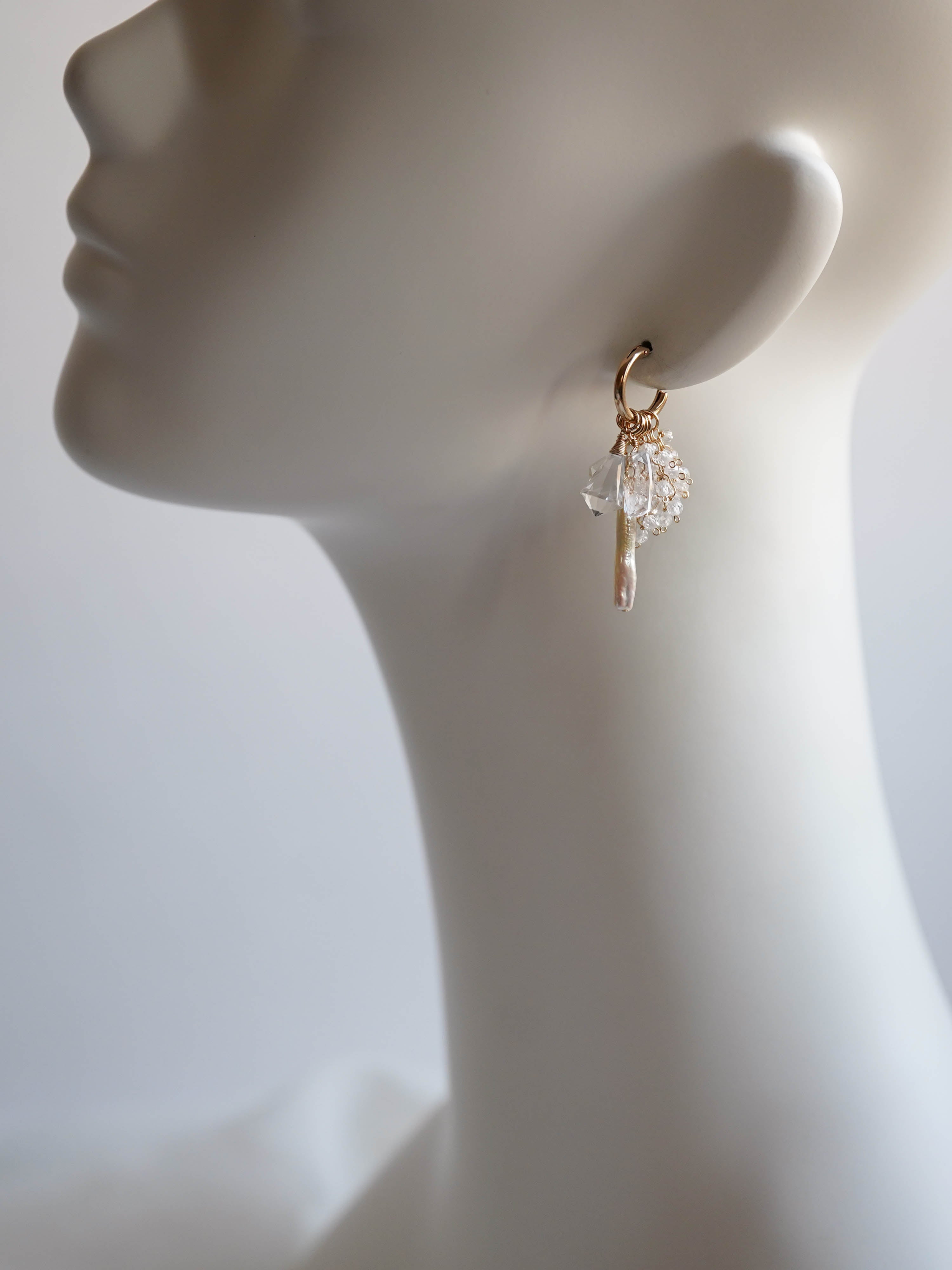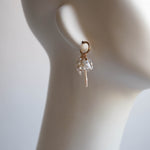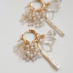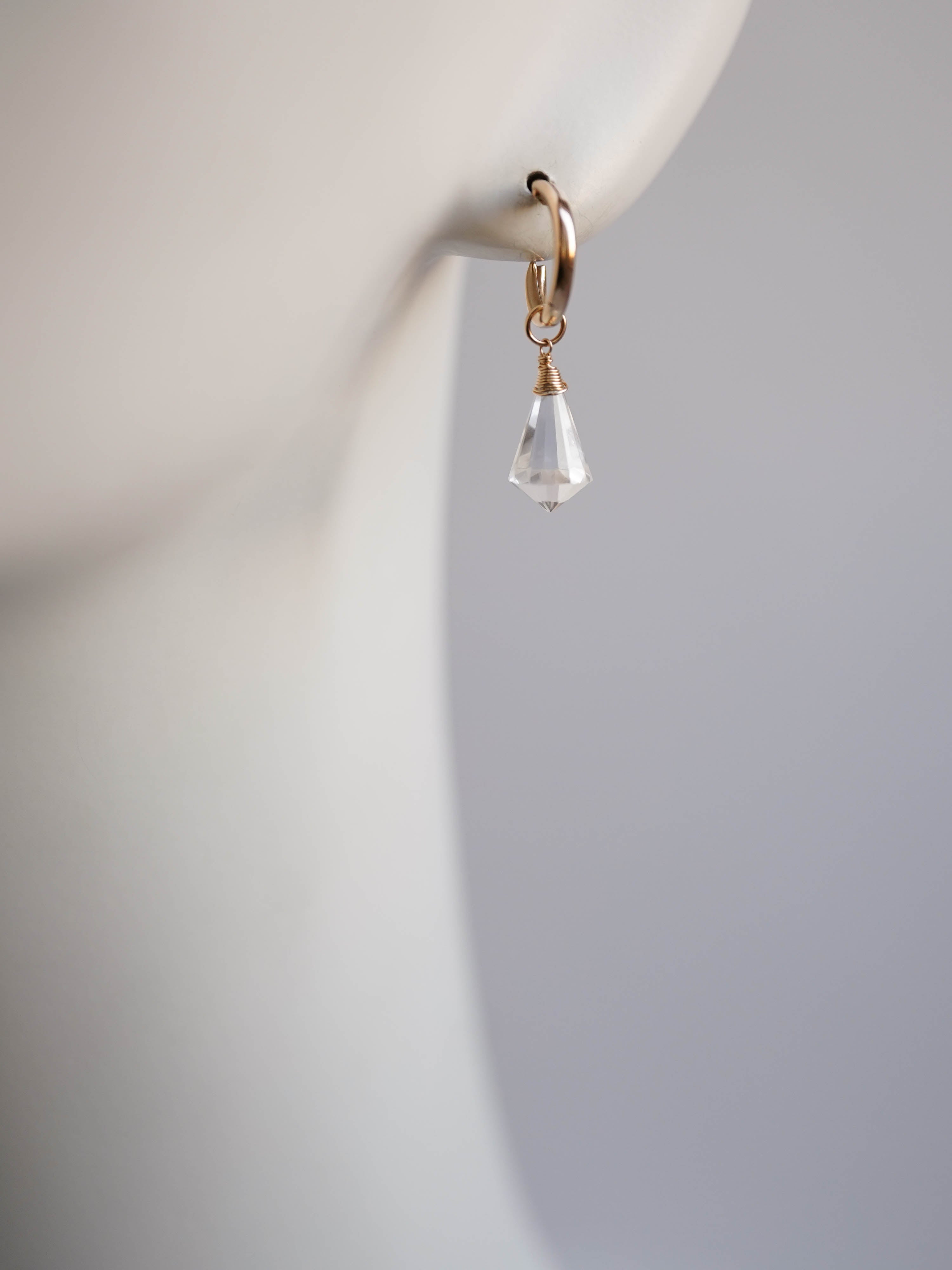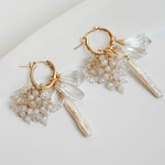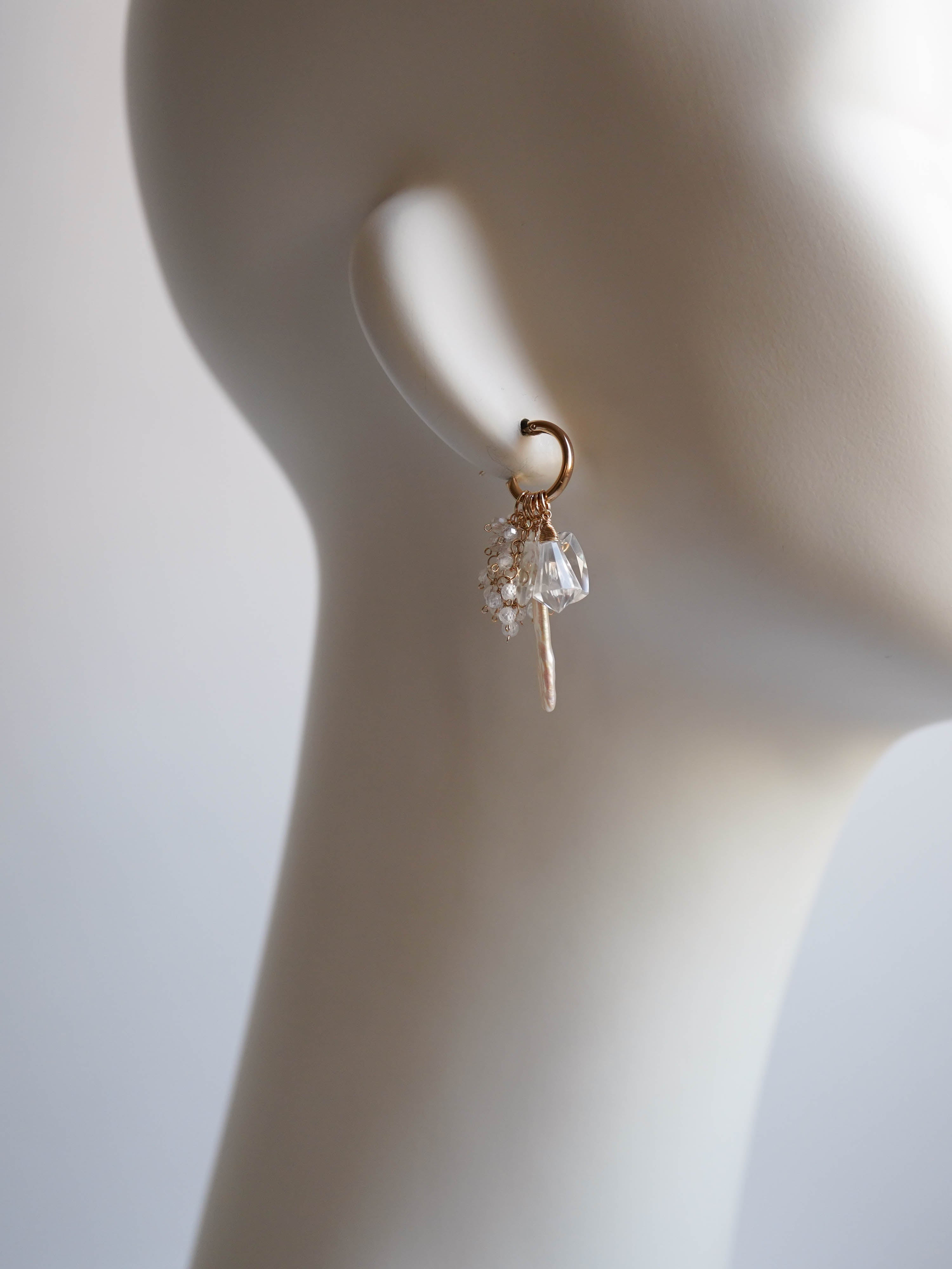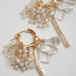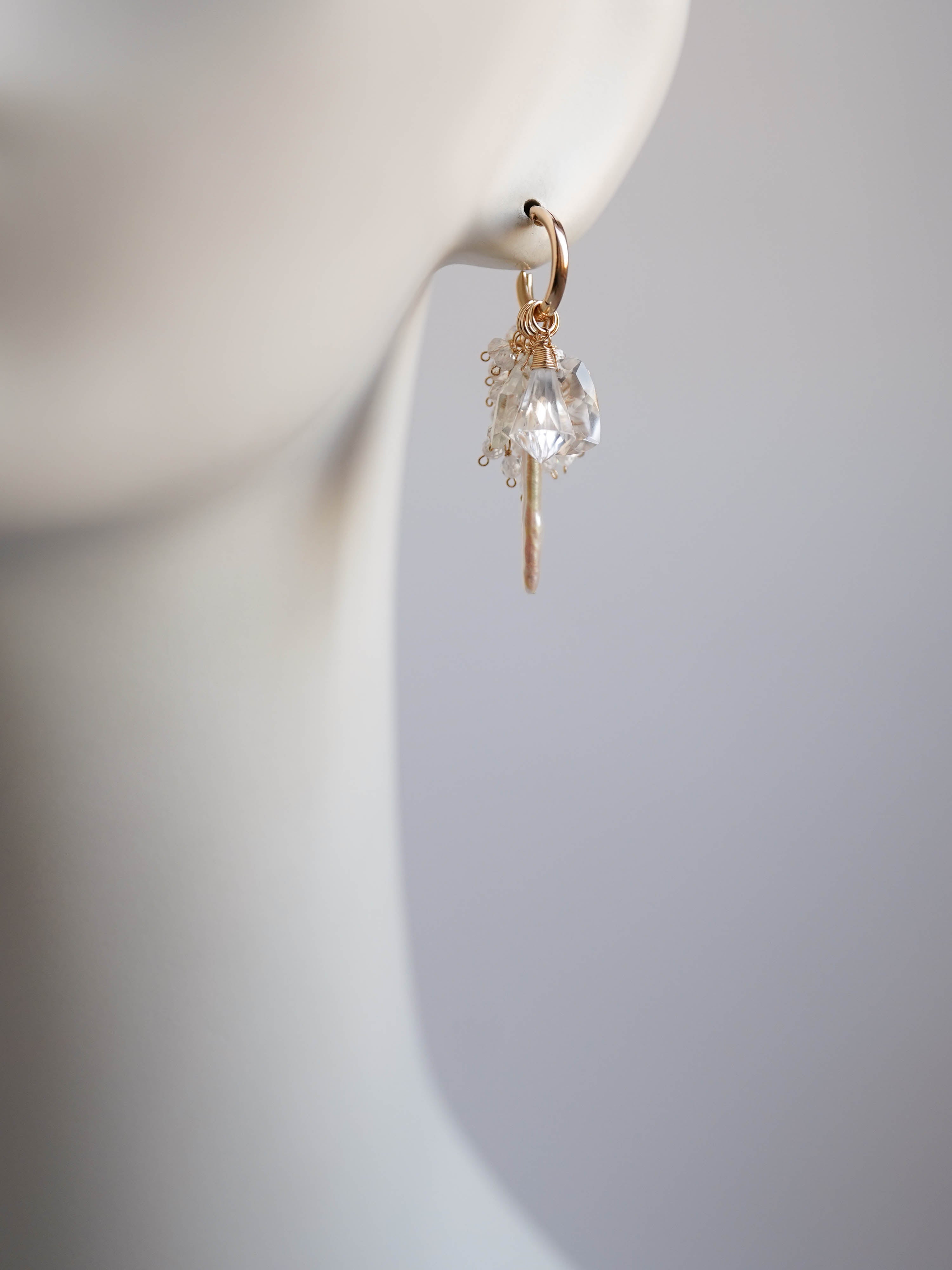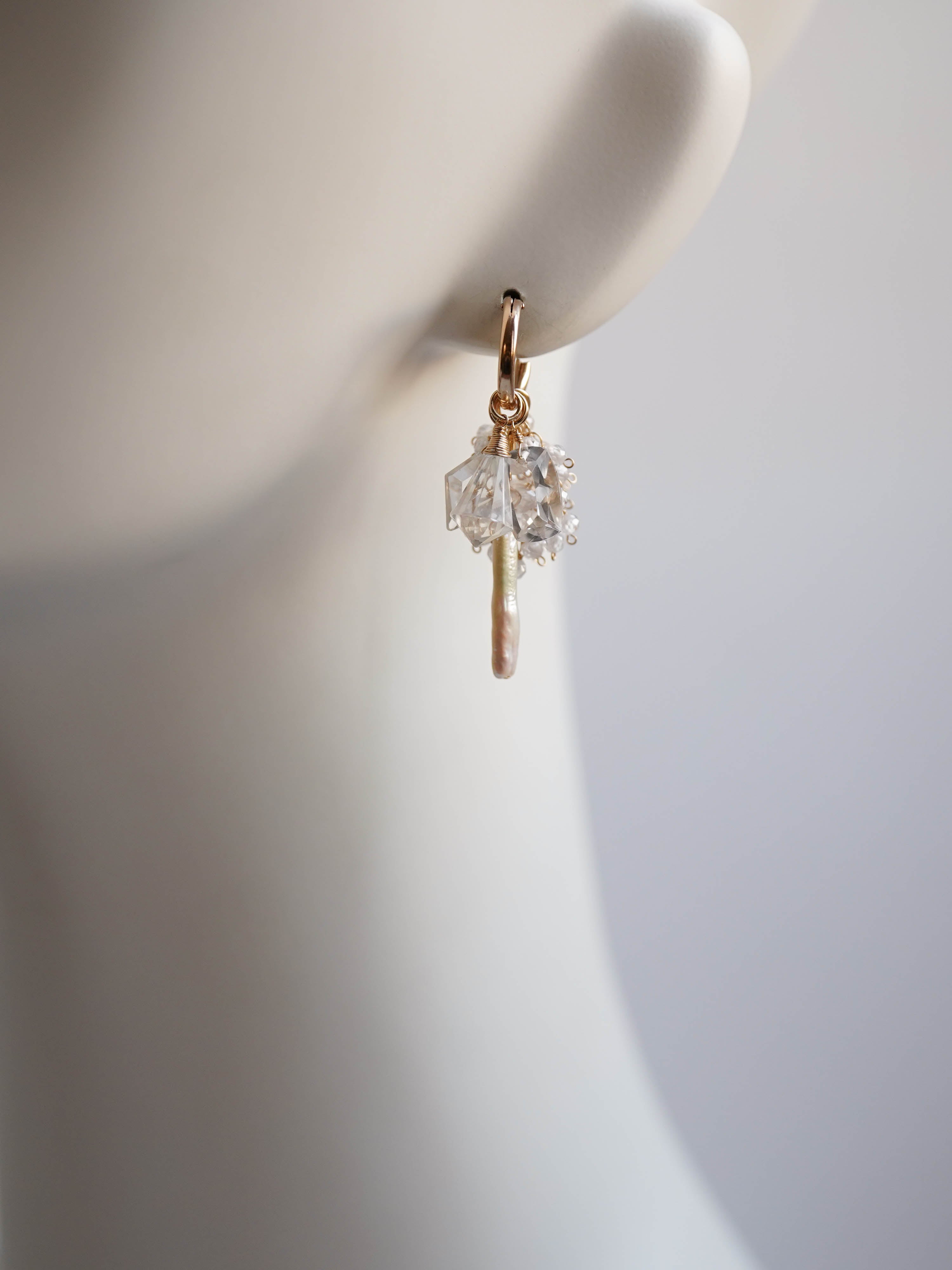 雪が降り積もる白銀の世界をイメージして制作した着せ替えボリュームピアスです。透明度の高い3種類のクリスタルで透き通った氷を、小粒のジルコニアとクリスタルで細やかに輝く雪の煌めきを表現しました。カット、形、ニュアンスがそれぞれ異なる天然石を重ねることで、静かな華やかさと上品な雰囲気に。シンプルな装いに存在感のある輝きを添えてくれます。